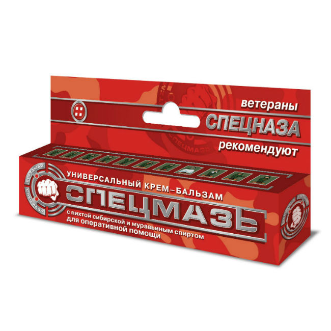 Спецмазь крем-бальзам универсальный с пихтой сибирской и муравьиным спиртом - успокаивает боль, снимает воспаления, оказывает антисептическое, обеззараживающее, бактерицидное действие, способствует заживлению тканей при различных повреждениях кожи, Спецмазь крем-бальзам стимулирует активное восстановление поврежденных волокон и способствует снятию боли и ликвидации отёков, укорачивает реабилитационный период при травмах. Спецмазь крем-бальзам высокоэффективен при «ноющих» болях в суставах, при «прострелах» в спине и др.