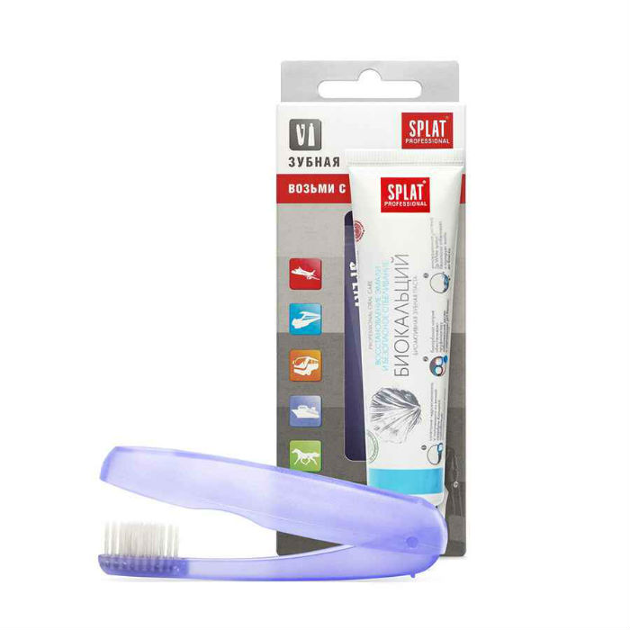 Комплексная зубная паста СПЛАТ бережливо относится к белизне чувствительной эмали.Кальцис, лактат кальция полученный из скорлупы яйца, лучше всего усваивается в эмали и защищает от кариеса и гидроксиапатит (ГАП) - основное строительное вещество эмали.. Природный фермент Папаин в сочетании с Полидоном предотвращают образование мягкого и твердого налета. Ионы калия и цинка устраняют чувствительность эмали и обладают вяжущим и противовоспалительным эффектом на десна. Уникальная система Sp.White System мягко отбеливает и полирует эмаль до скрипа. Без фтора. Преимущества щетки: щетка в сложенном виде щетинки защищены от попадания грязи в рукоятке щетки есть специальные отверстия для вентиляции щетинка средней жесткости, с утонченными кончиками.