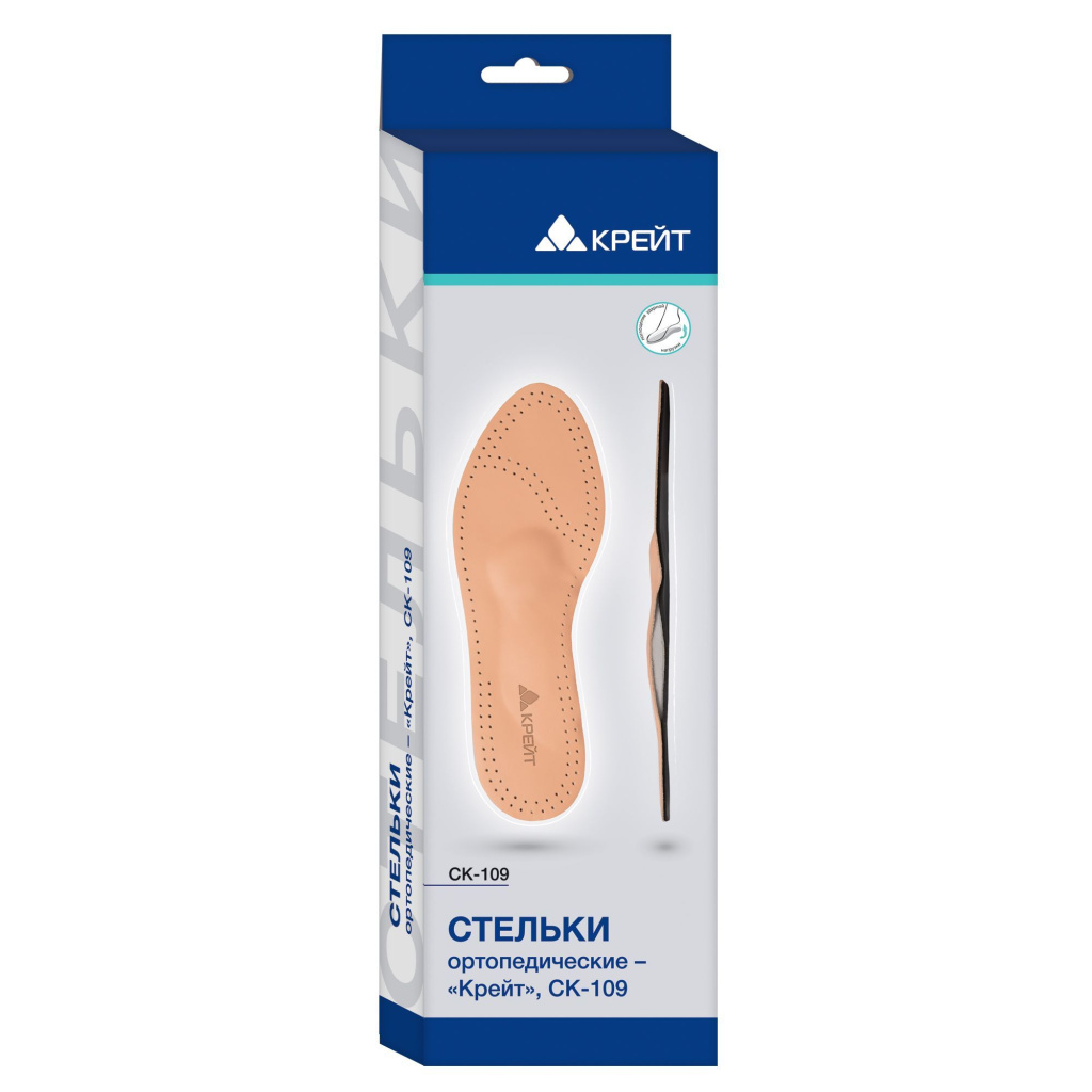Стельки ортопедические «Крейт» СК-109 предназначены для восстановления или компенсации статодинамической функции стопы, для профилактики продольного, поперечного и комбинированного плоскостопия и ношения в повседневной и модельной обуви с каблуком до 7 см.