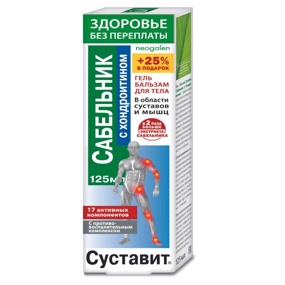 Гель-бальзам для тела "Суставит. Сабельник. Хондроитин. 17 активных компонентов" товарного знака Neogalen (Неогален) серии "Здоровье без переплаты" – эффективное средство на основе природных компонентов. Способствует нормализации функционального состояния. Обеспечивает структурными элементами для активного обновления и гибкости.