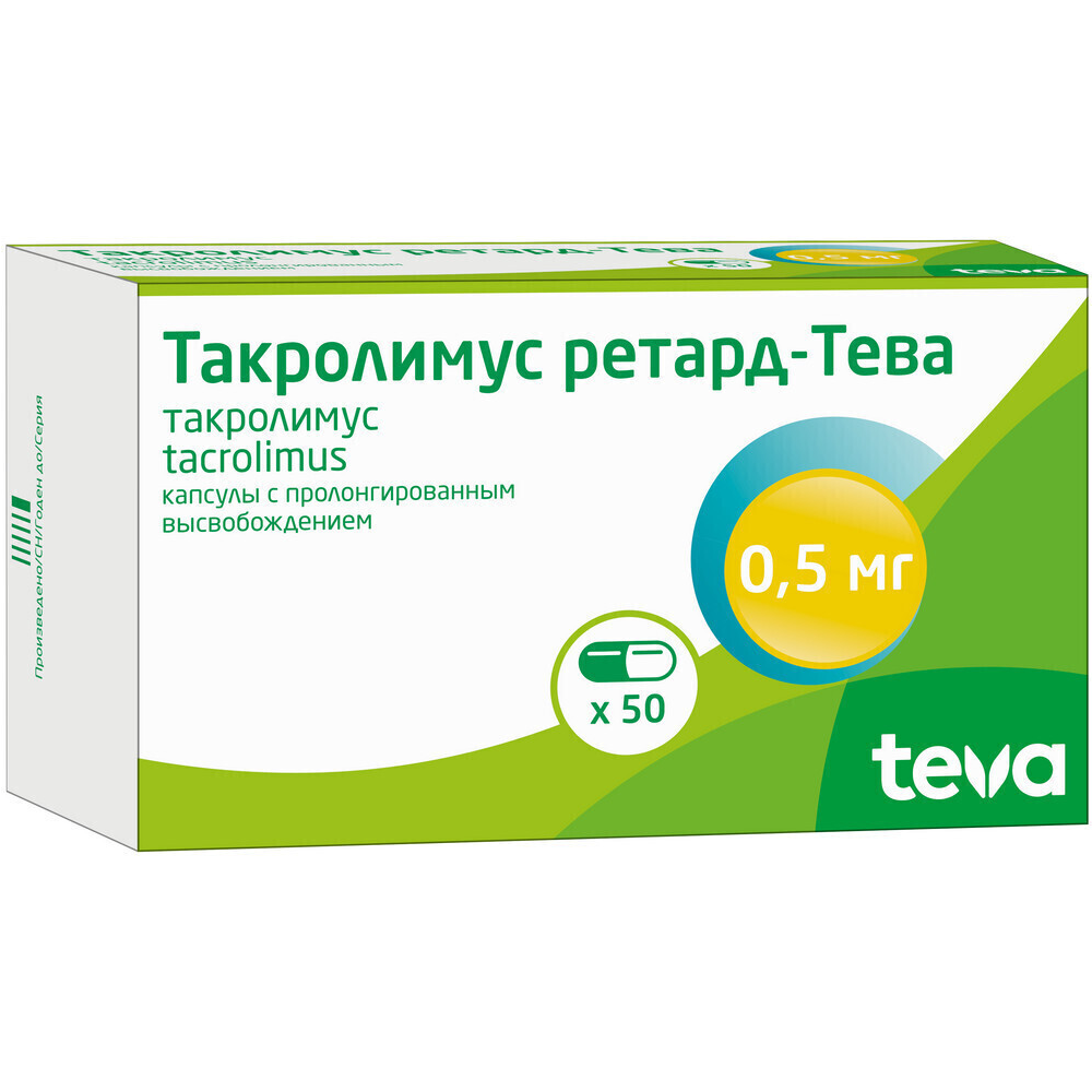 Каждая капсула препарата Такролимус ретард-Тева 0,5 мг содержит 0.5 мг такролимуса (в виде моногидрата).