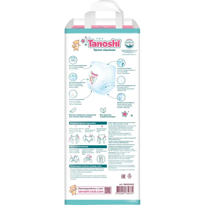 Детские трусики-подгузники Tanoshi (Таноши) для малышей с весом 9-14 кг – ультратонкие, как хлопковое бельё, и мягкие одноразовые трусики. Они не стесняют движения непоседы, который активно ползает и делает первые шаги. Tanoshi сохраняют кожу ребёнка сухой длительное время между сменой трусиков. Они удобно снимаются, надеваются и не сползают во время ношения.