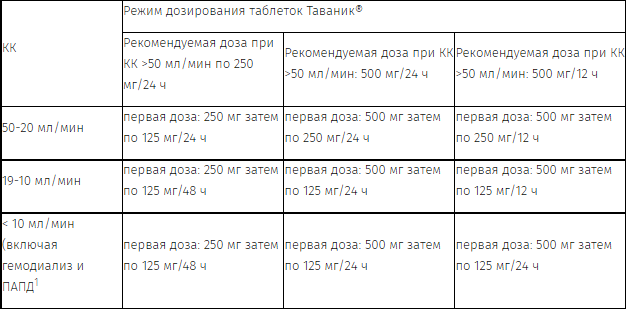 Левофлоксацин выводится преимущественно почками, поэтому при лечении пациентов с нарушенной функцией почек требуется снижение дозы препарата (см. таблицу ниже).