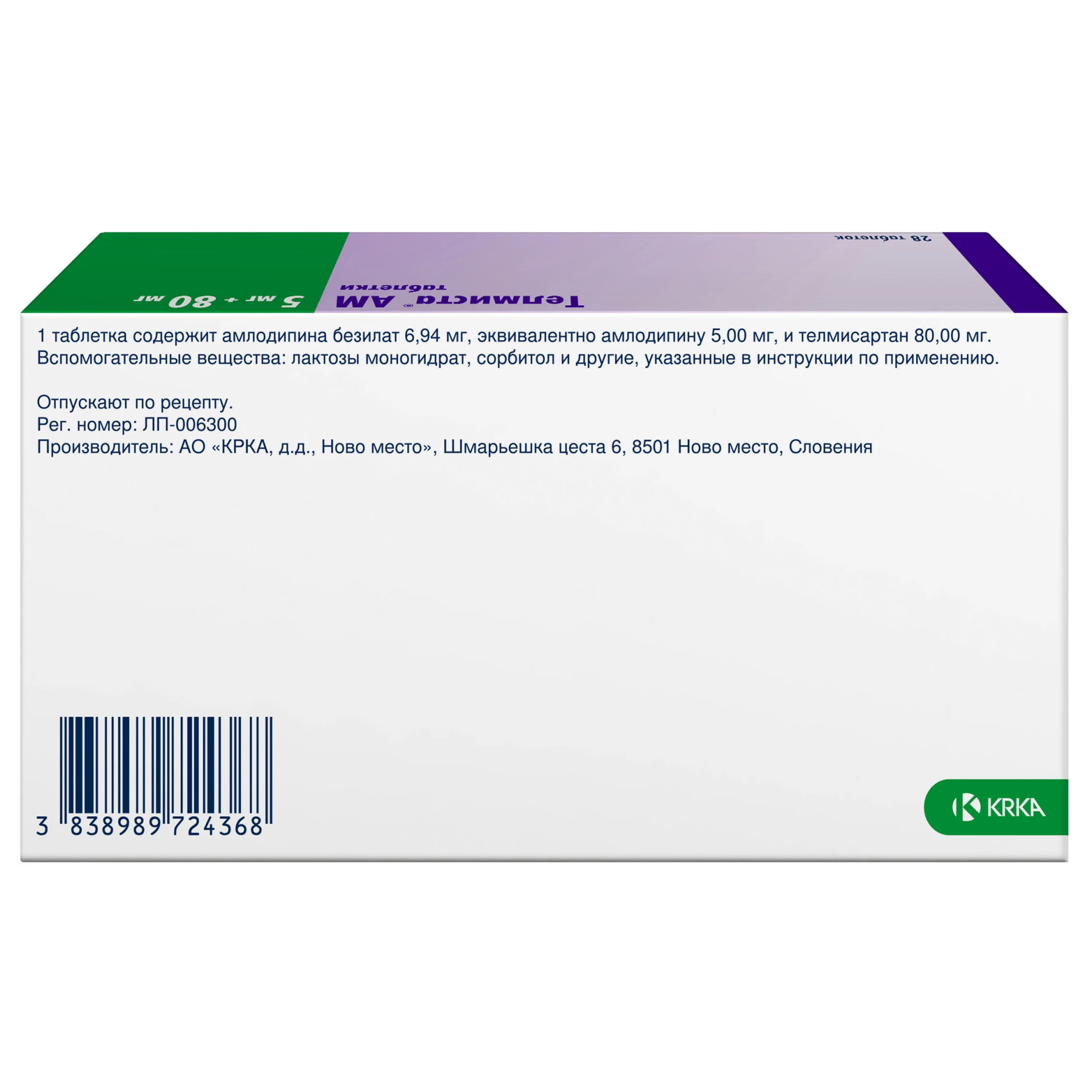 пациентам, у которых применение только амлодипина или только телмисартана не приводит к адекватному контролю АД. Пациенты, принимающие амлодипин в дозе 10 мг, у которых отмечаются HP, ограничивающие прием препарата, например, периферичесие отеки, могут быть переведены на препарат Телмиста® AM в дозе 5 мг + 40 мг 1 раз в сутки, что позволит уменьшить дозу амлодипина, но не снизит общее ожидаемое антигипертензивное действие.