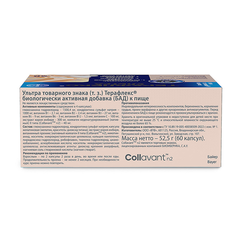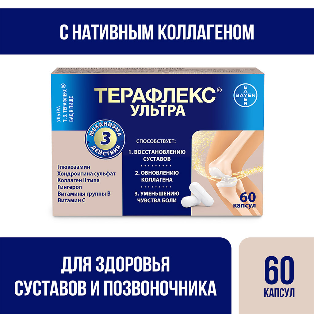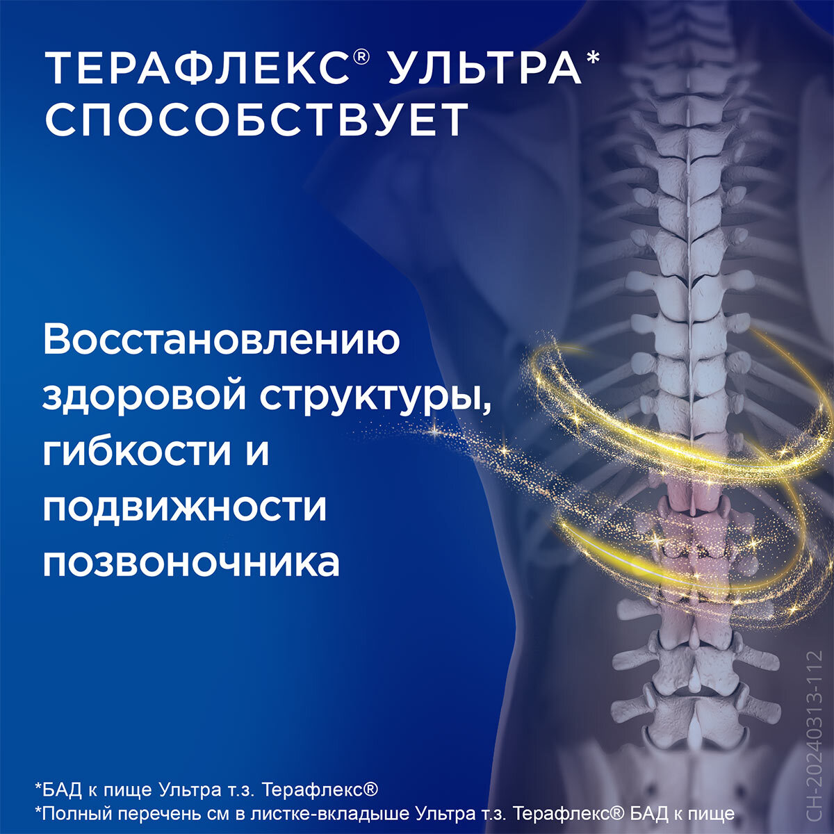 Ультра Терафлекс® БАД к пище – это комбинация хондропротекторов хондроитина и глюкозамина – важнейших структурных компонентов хрящевой ткани суставов, усиленная следующими ингредиентами: