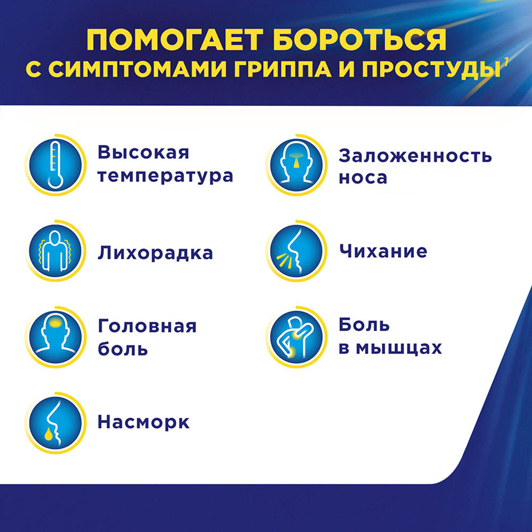 Симптоматическая терапия инфекционно-воспалительных заболеваний (ОРВИ, грипп), сопровождающихся высокой температурой, лихорадкой, головной болью, насморком, заложенностью носа, чиханием и болями в мышцах.
