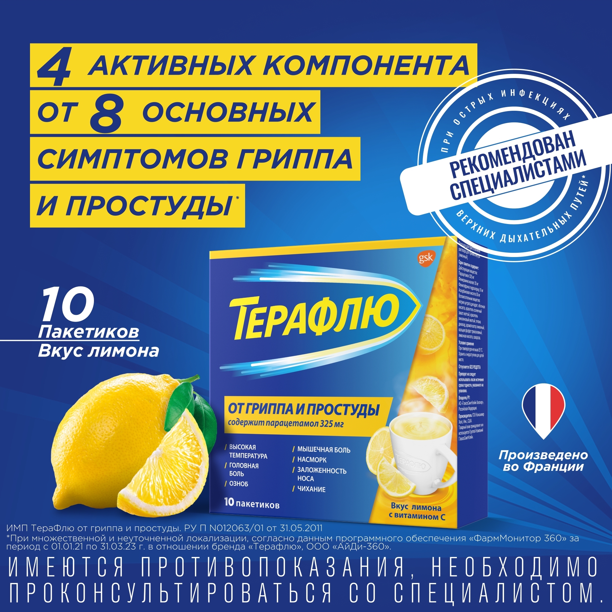 ТераФлю от гриппа и простуды можно применять в любое время суток, но наилучший эффект приносит прием препарата перед сном, на ночь. Если не наблюдается облегчения симптомов в течение 3 дней после начала приема препарата, необходимо обратиться к врачу.