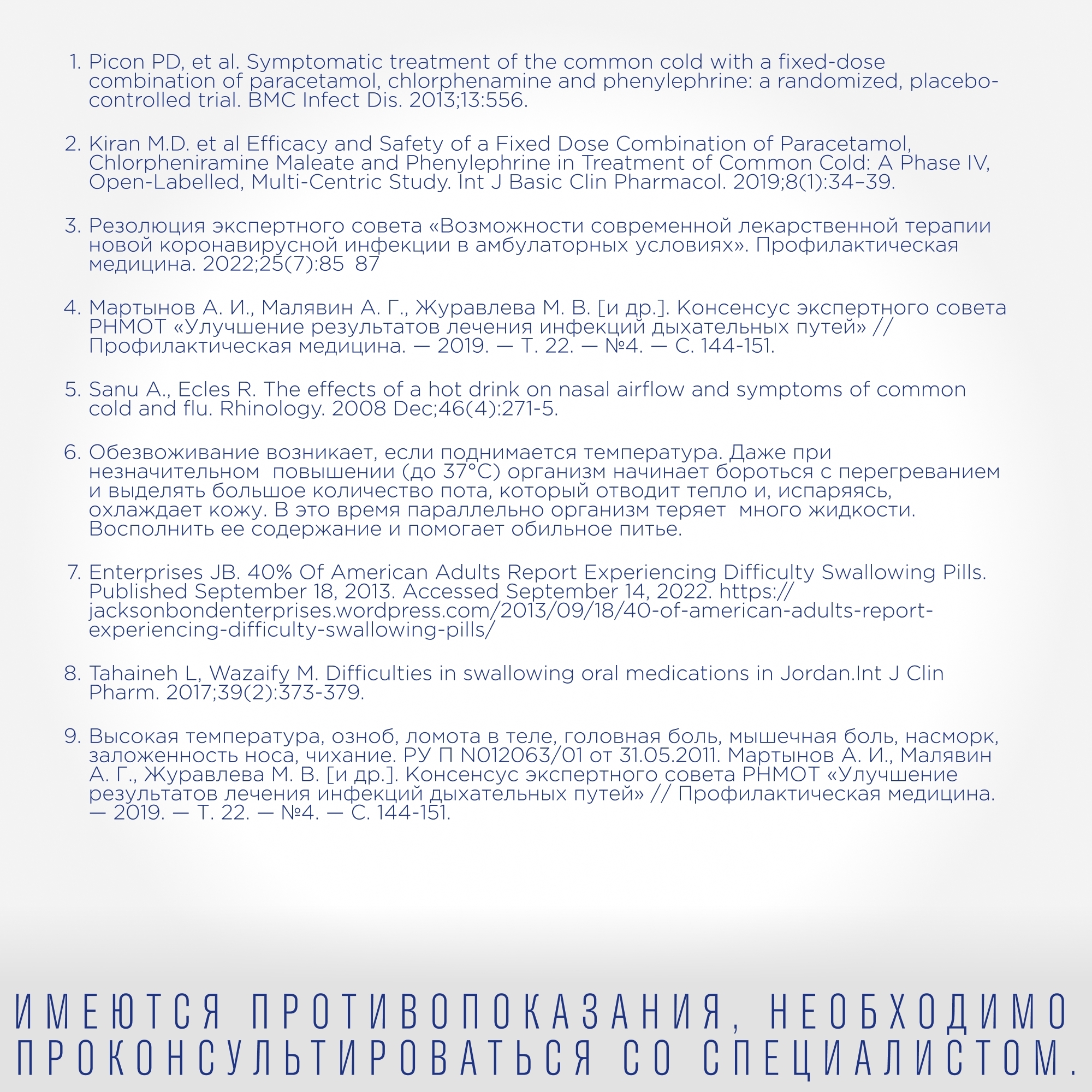 Комбинированный препарат, действие которого обусловлено входящими в его состав компонентами. Оказывает жаропонижающее, анальгезирующее, сосудосуживающее действие, устраняет симптомы "простуды". Сужает сосуды и устраняет отек слизистой оболочки полости носа и носоглотки.