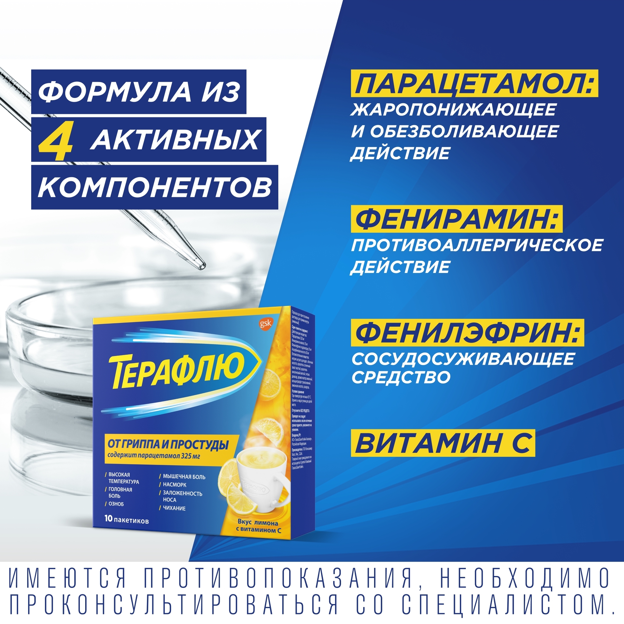 Терафлю от гриппа и простуды противопоказан пациентам, которые получают или получали ингибиторы МАО в течение последних 2 недель. Фенилэфрин может потенцировать действие ингибиторов МАО и вызвать гипертонический криз.