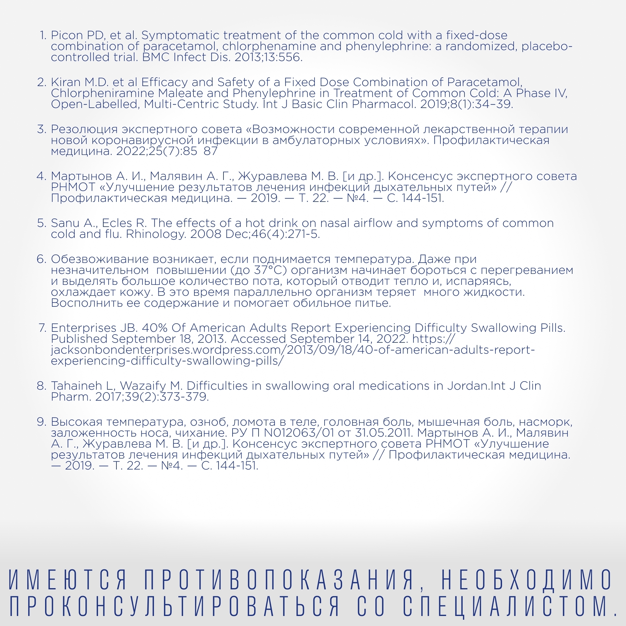 Внутрь. Содержимое одного пакетика растворяют в 1 стакане горячей, но не кипящей воды. Принимают в горячем виде. Повторную дозу можно принимать через каждые 4-6 ч (не более 3-4 доз в течение 24 ч).