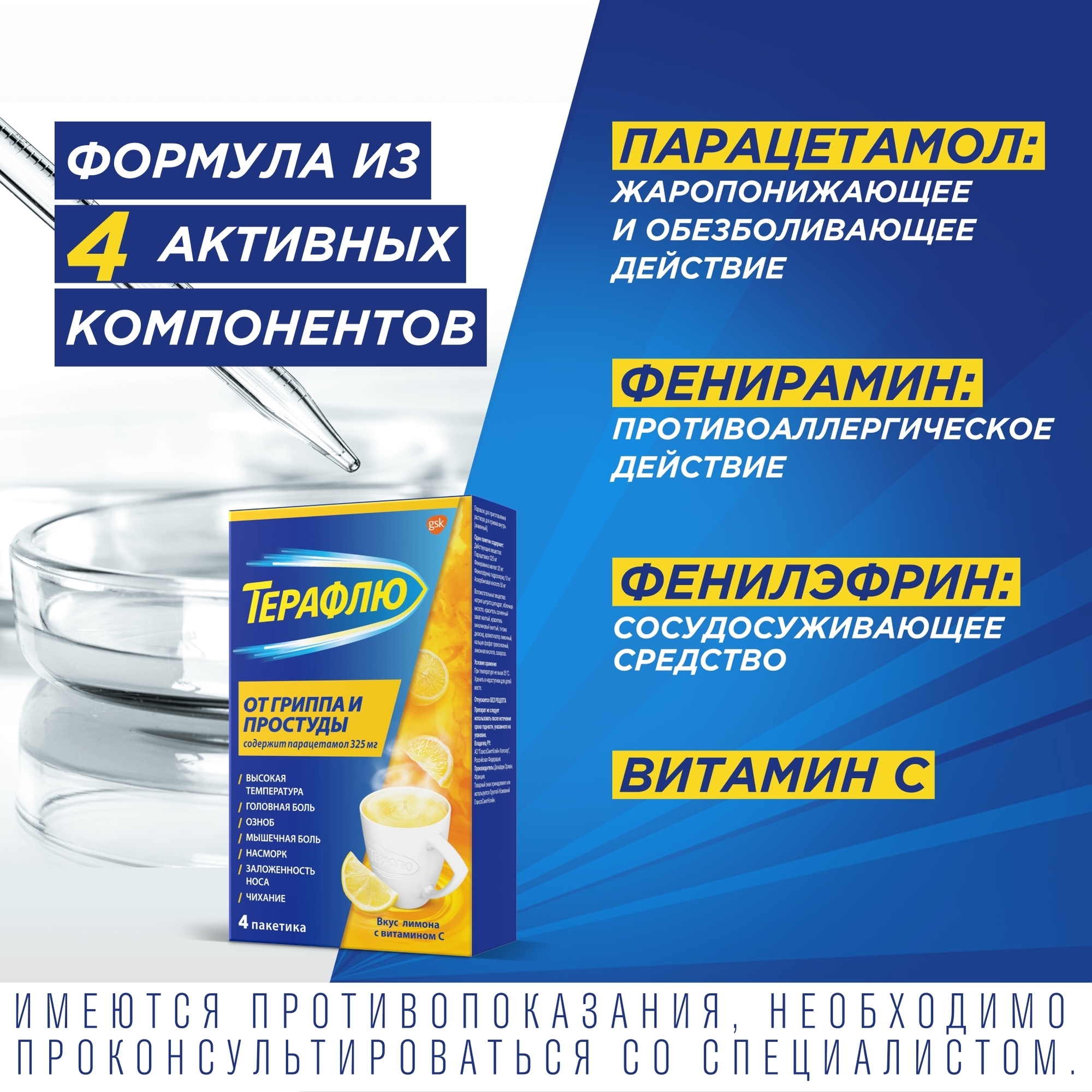 ТераФлю от гриппа и простуды может вызывать сонливость, поэтому во время лечения не рекомендуется управлять автомобилем и заниматься другими видами деятельности, требующими концентрации внимания и высокой скорости психомоторных реакций.