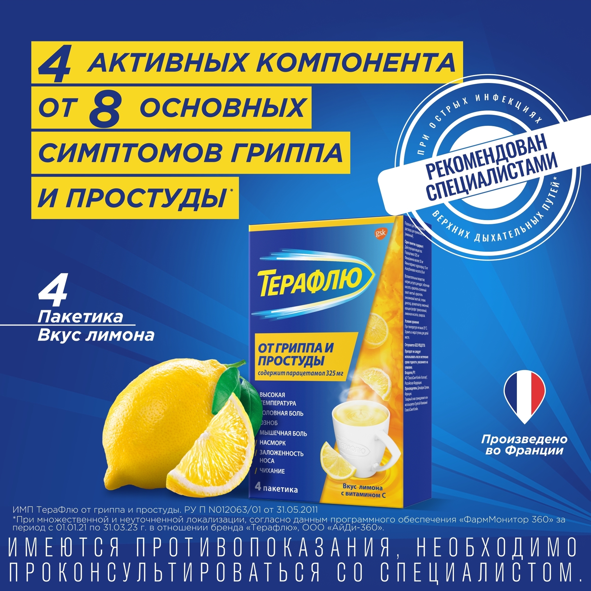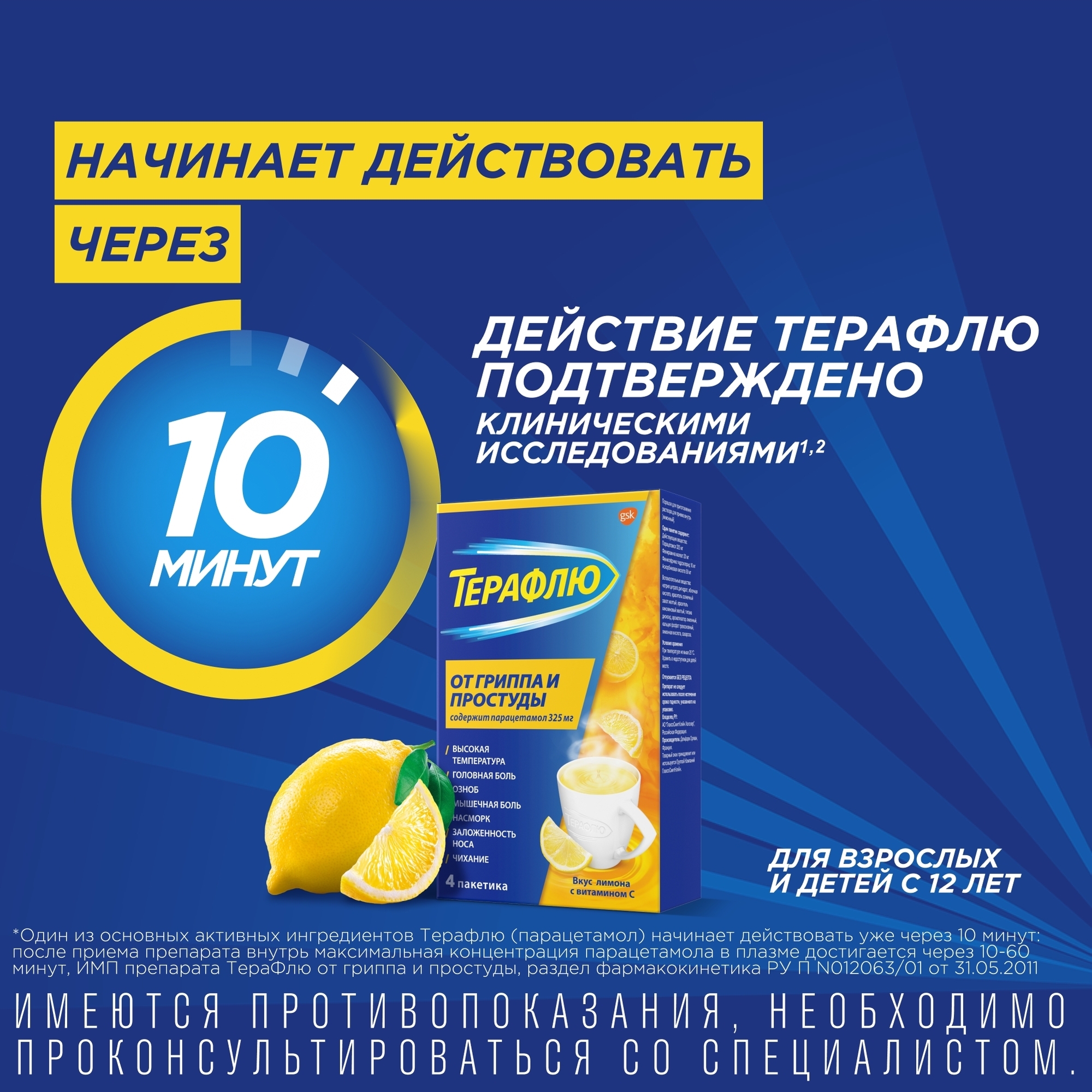 ТераФлю от гриппа и простуды можно применять в любое время суток, но наилучший эффект приносит прием препарата перед сном, на ночь. Если не наблюдается облегчения симптомов в течение 3 дней после начала приема препарата, необходимо обратиться к врачу.