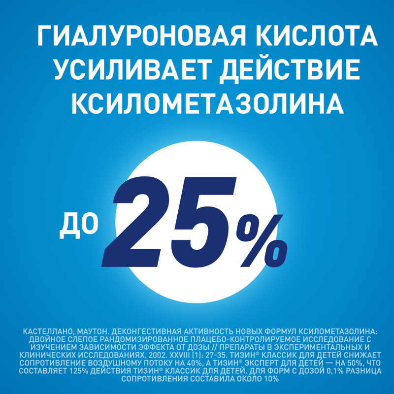 ТИЗИН® Эксперт для взрослых – уникальный спрей для лечения насморка с гиалуроновой кислотой (1) во флаконе с особой спиралью с ионами серебра. Гиалуроновая кислота дополнительно увлажняет раздраженную слизистую носа и способствует ее скорейшему восстановлению (2), а спираль с ионами серебра в распылителе Тизин® Эксперт деактивирует бактерии. (3) 1.Единственный зарегистрированный в РФ спрей от насморка с ксилометазолином и гиалуроновой кислотой в составе 2. Топические деконгестанты в комплексе терапии острых респираторных инфекций у детей, А.Б. Малахов и соавт. Медицинский совет №14, 2015 г. 3. Деактивация бактерий происходит во флаконе. Спираль в составе распылителя, содержащая серебро, обладающее бактериостатическими свойствами для предотвращения попадания бактерий в препарат. Не является свойством препарата Тизин® Эксперт.