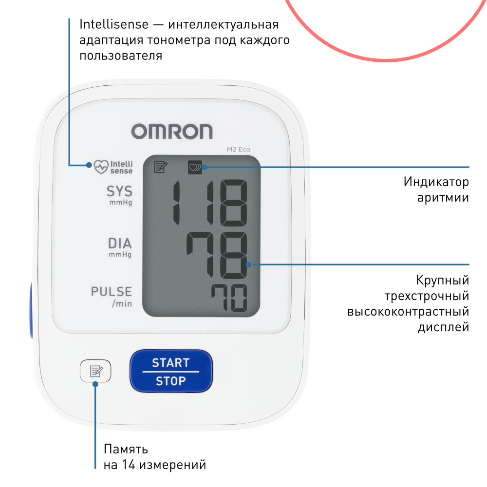 OMRON M2 Eco ARU – тонометр автоматический на плечо для измерения давления и частоты пульса. Набор оптимальных функций по доступной цене. Запатентованная технология IntelliSense от компании OMRON Управляет процессом измерения и рассчитывает давление из трех показателей: ЧСС (частоты сердечных сокращений), времени измерения и осцилляции. Благодаря этому процесс измерения и давление в манжете подстраиваются под конкретного пользователя, который может быть уверен в точности полученного результата. Тонометр для давления клинически апробирован. Его датчик давления – главный компонент для измерения артериального давления, производится в Японии. Стандартная веерообразная манжета для тонометра 22–32 см повторяет форму плеча и плотно его облегает. За счет этого давление распределяется по манжете равномерно. Все тонометры для измерения давления OMRON снабжены индикатором аритмии – алгоритмом обнаружения нерегулярного сердцебиения. Если прибор обнаружит при измерении измененный сердечный ритм, он оценит достоверность результатов. В том случае если тонометр не сможет провести измерение, на экране появится значок ошибки, а измерение придется повторить. Если значок аритмии появляется часто, нужно обратиться к врачу. Графический индикатор уровня артериального давления поможет сориентироваться в показаниях и сверить их с отметками о нормах давления. Объем памяти рассчитан на 14 измерений. Тонометр автоматический работает от адаптера переменного тока и также от четырех элементов питания АА (в комплекте), что позволяет держать давление под контролем не только дома, но и на работе, на даче, в поездке. Обслуживание в собственных сервисных центрах в 77 городах России, каждый их которых гарантирует качество предоставления сервисных услуг по ремонту медицинской техники OMRON. Комплектация Электронный блок, манжета компрессионная CM, руководство по эксплуатации, чехол для хранения прибора, комплект элементов питания, адаптер переменного тока, журнал для записи артериального давления, гарантийный талон.