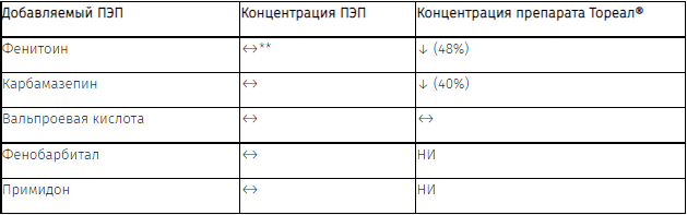 Одновременный прием препарата Тореал® с другими ПЭП (фенитоин, карбамазепин, вальпроевая кислота, фенобарбитал, примидон) не оказывает влияния на значения их равновесных концентраций в плазме, за исключением отдельных больных, у которых добавление препарата Тореал® к фенитоину может вызвать повышение концентрации фенитоина в плазме. Это может быть связано с угнетением специфической полиморфной изоформы фермента системы цитохрома Р450 (изофермента CYP2C19). Поэтому у каждого больного, который принимает фенитоин и у которого развиваются клинические признаки или симптомы токсичности, необходимо следить за концентрацией фенитоина в плазме.