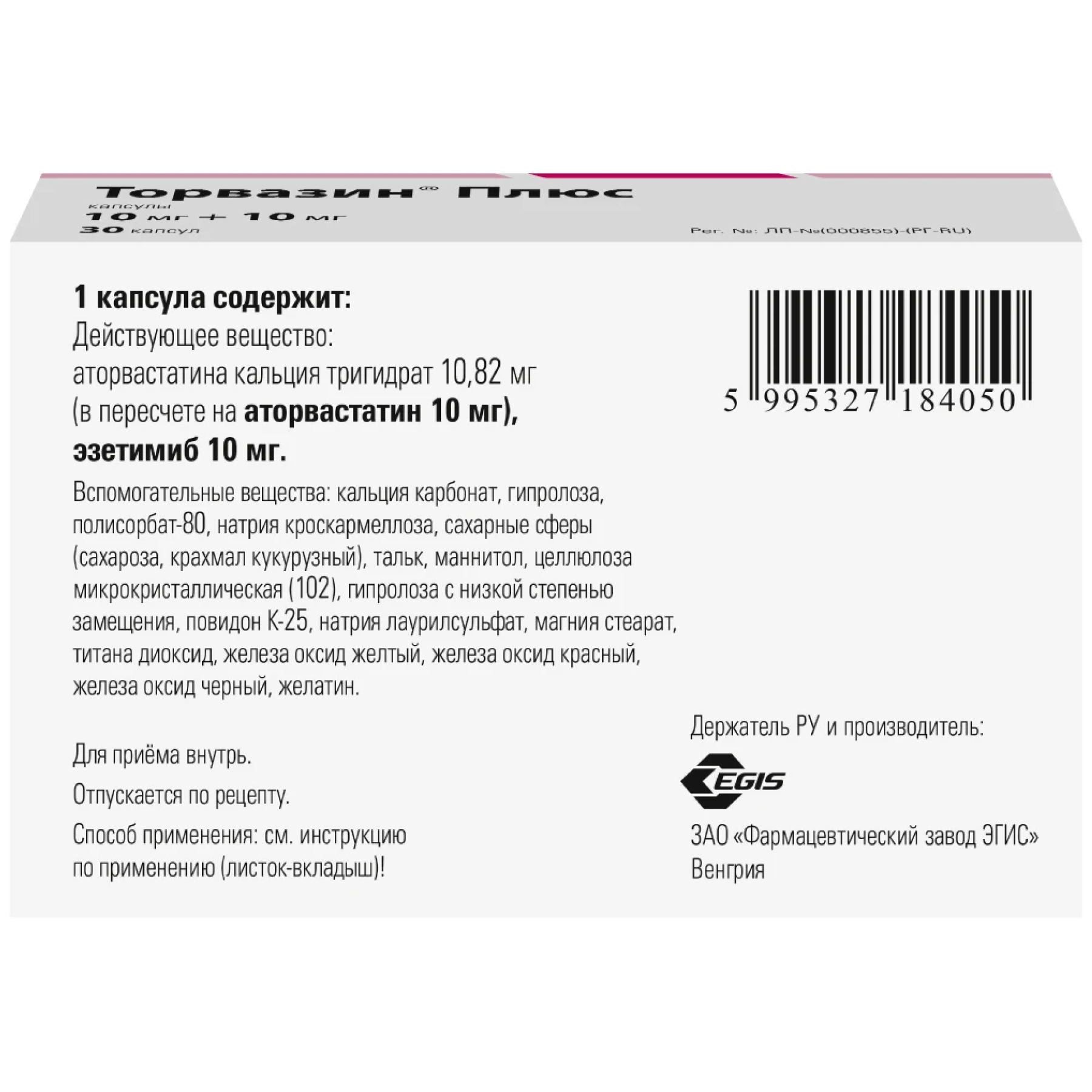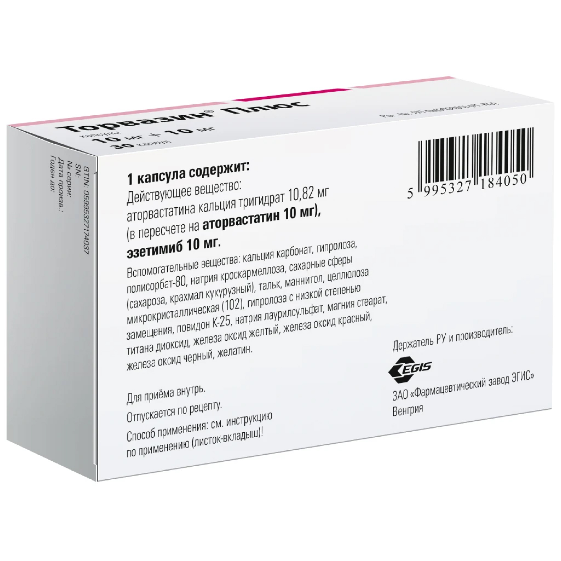 В препарате Торвазин® Плюс, 10 мг + 10 мг, капсулы, содержится 13 мг сахарозы, в препарате Торвазин® Плюс, 20 мг + 10 мг, капсулы – 26 мг сахарозы, в препарате Торвазин® Плюс, 40 мг + 10 мг, капсулы – 51,5 мг сахарозы. Если у вас непереносимость некоторых сахаров, обратитесь к лечащему врачу или работнику аптеки перед приемом данного лекарственного препарата.