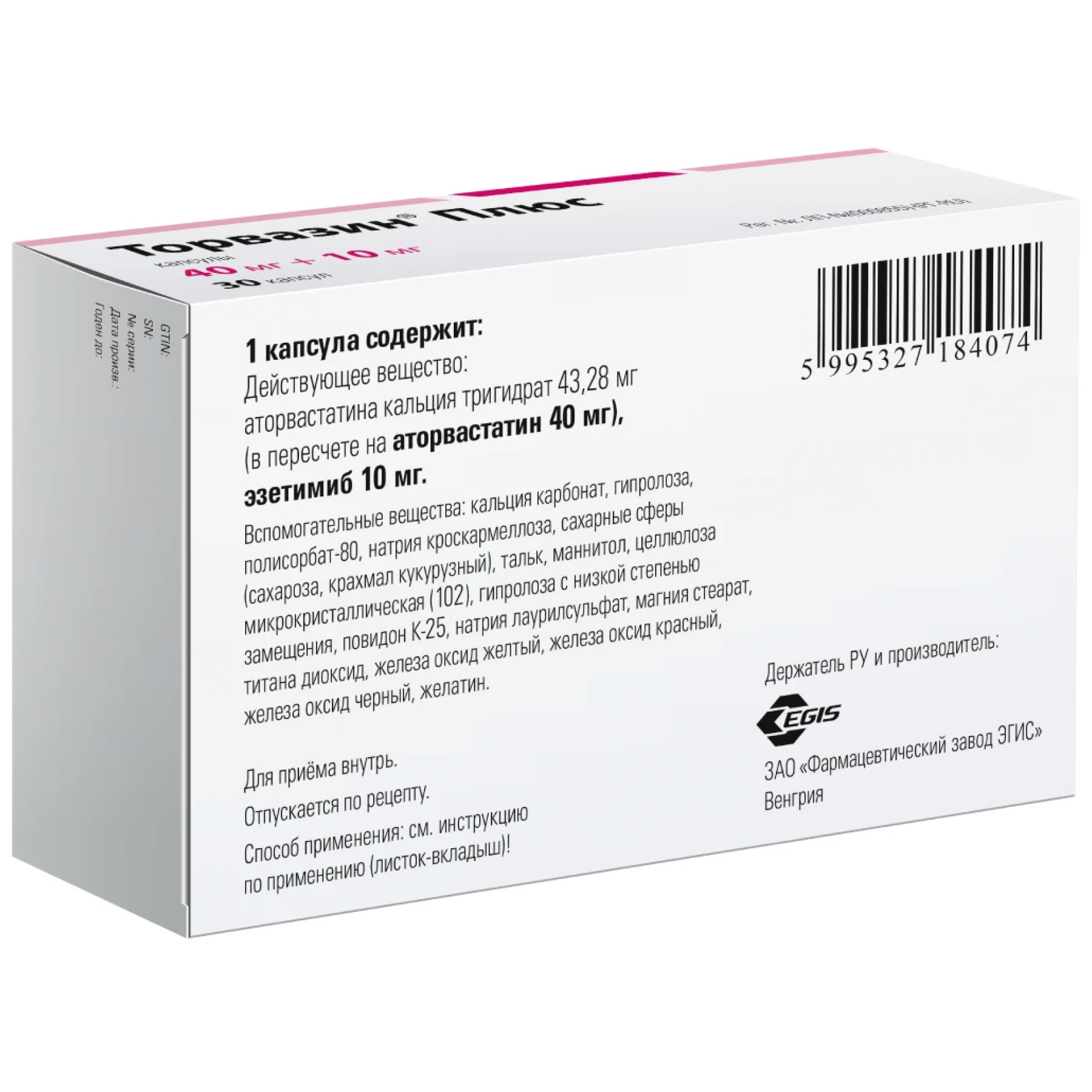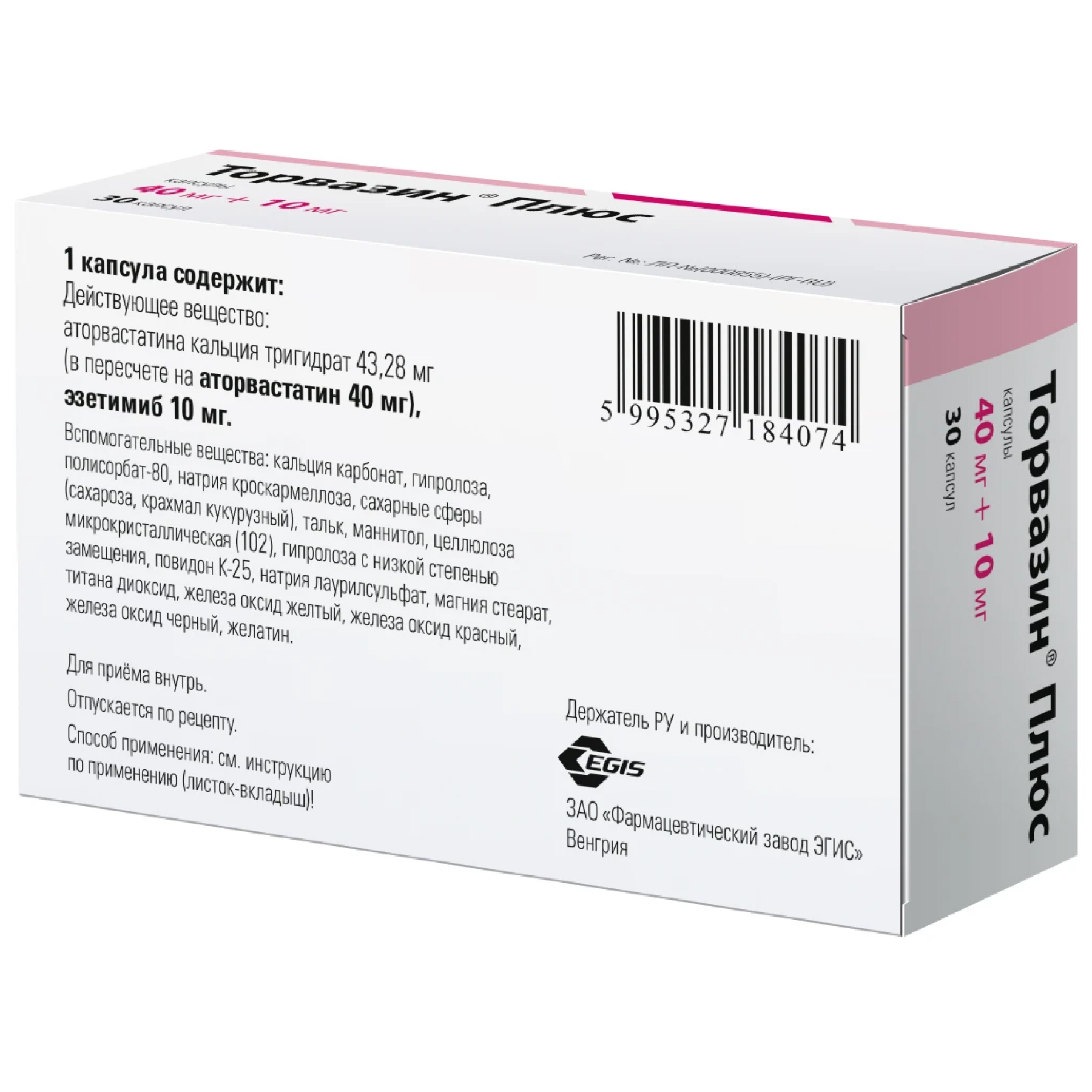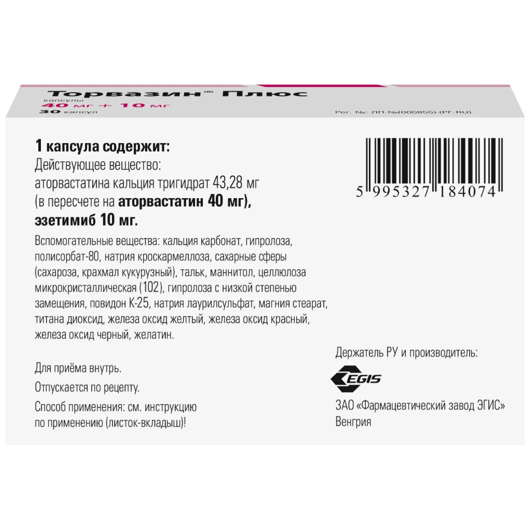 В препарате Торвазин® Плюс, 10 мг + 10 мг, капсулы, содержится 13 мг сахарозы, в препарате Торвазин® Плюс, 20 мг + 10 мг, капсулы – 26 мг сахарозы, в препарате Торвазин® Плюс, 40 мг + 10 мг, капсулы – 51,5 мг сахарозы. Если у вас непереносимость некоторых сахаров, обратитесь к лечащему врачу или работнику аптеки перед приемом данного лекарственного препарата.