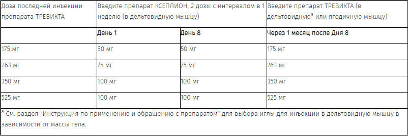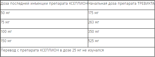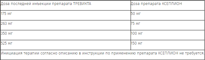Применение препарата ТРЕВИКТА следует начинать в день, соответствующий следующей запланированной инъекции препарата КСЕПЛИОН, с использованием дозы препарата ТРЕВИКТА, рассчитанной исходя из предшествующей дозы препарата КСЕПЛИОН, согласно Таблице 1. Препарат ТРЕВИКТА можно вводить на 7 дней раньше или позже дня следующей запланированной инъекции препарата КСЕПЛИОН.