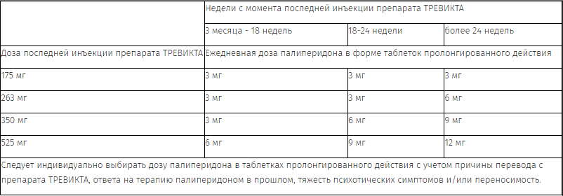 Для перехода с препарата ТРЕВИКТА на таблетки палиперидона пролонгированного действия ежедневный прием этих таблеток следует начать через 3 месяца после последней инъекции препарата ТРЕВИКТА, переход осуществляется на протяжении следующих нескольких месяцев в соответствии с описанием в Таблице 4. В Таблице 4 содержатся режимы пересчета доз, которые позволяют достичь схожих концентраций палиперидона в плазме при приеме таблеток палиперидона пролонгированного действия 1 раз в сутки у пациентов с ранее достигнутым стабильным состоянием на различных дозах препарата ТРЕВИКТА.