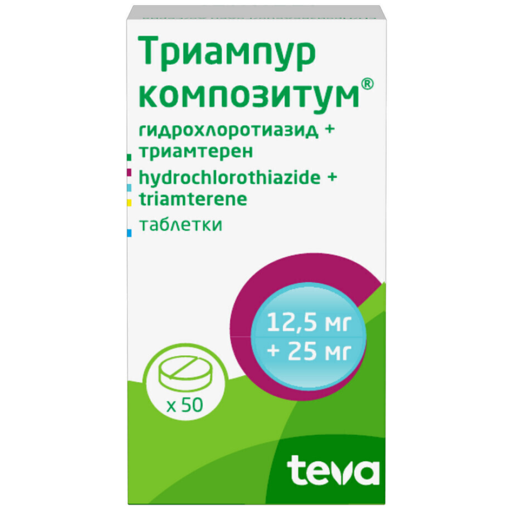 Активные вещества: гидрохлоротиазид 12.5 мг, триамтерен 25 мг.