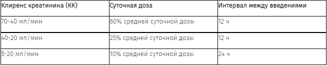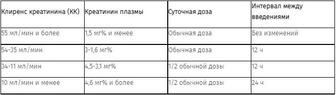 Больным с нарушениями функции почек требуется изменение режима дозирования в соответствии со значениями клиренса креатинина (КК):