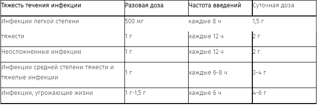 Детям старше 1 месяца - 25-50 мг/кг/сутки; при тяжелом течении инфекции доза может быть увеличена - до 100 мг/кг/сутки. Кратность введения 3-4 раза в сутки.