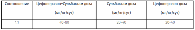 При тяжелых или рефрактерных инфекциях суточная доза цефоперазона+сульбактама может быть увеличена до 8000 мг при соотношении основных компонентов 1:1 (т. е. 4000 мг цефоперазона). Пациентам, получающим цефоперазон+сульбактам в соотношении 1:1, может потребоваться дополнительное введение цефоперазона. Дозу следует делить на равные части и вводить каждые 12 ч.