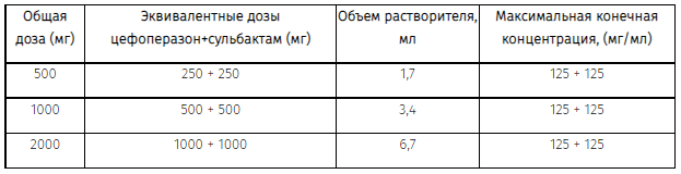 Для приготовления раствора для инфузий разводят 2000 мг (1000 мг+1000 мг) препарата Цефоперазон+Сульбактам в начальном объеме 6,7 мл одного из следующих инфузионных растворов: 5% раствор декстрозы, 5% раствор декстрозы в 0,225% растворе натрия хлорида, 5% раствор декстрозы в 0,9% растворе натрия хлорида, 0,9% раствор натрия хлорида или вода для инъекций, а затем разбавляют до 20 мл начальным раствором.