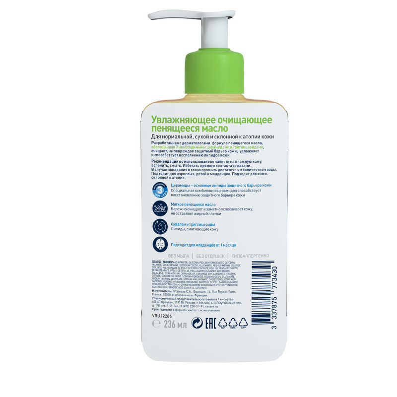 CeraVe® Мягкое пенящееся масло заметно успокаивает кожу, не оставляет жирной пленки. Формула обогащена скваланом и триглицеридами, которые смягчают кожу. Специальная комбинация трех необходимых церамидов способствует восстановлению защитного барьера кожи. Увлажняет и способствует восполнению липидов кожи. Подходит для взрослых, детей и младенцев от 1 месяца. Подходит для кожи, склонной к атопии.