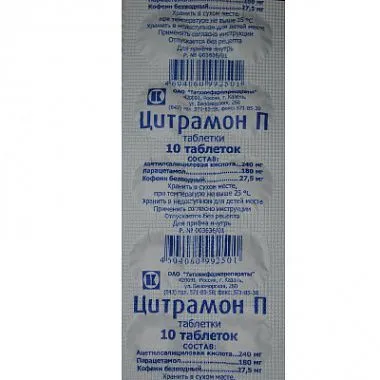 Действующие вещества: ацетилсалициловая кислота - 240 мг, кофеин - 27,5 мг (эквивалентно 30 мг кофеина моногидрата), парацетамол - 180 мг.
