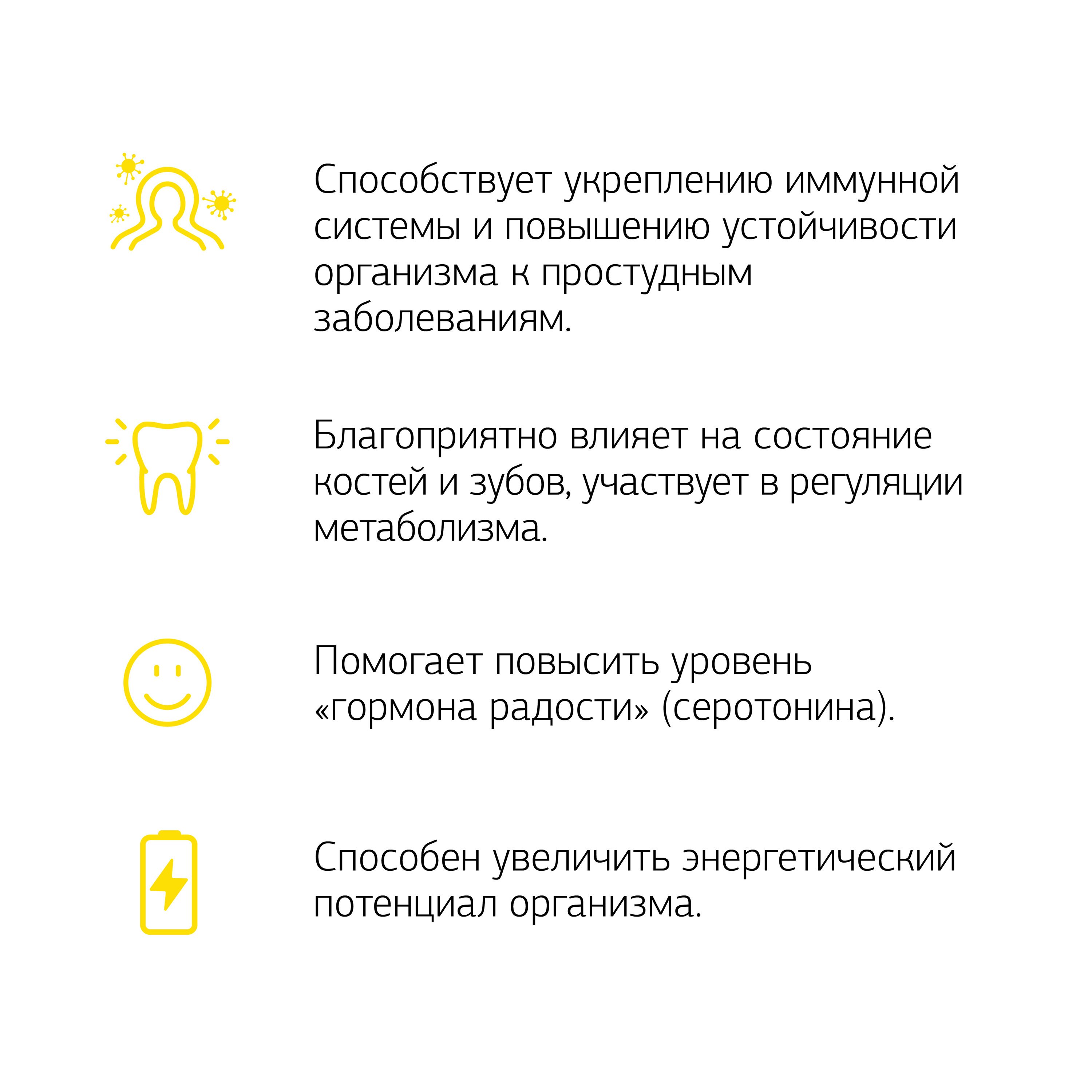 Позволяет эффективно проводить профилактику D-дефицита вследствие недостатка получения оптимального количества солнечного света или индивидуального дефицита витамина.