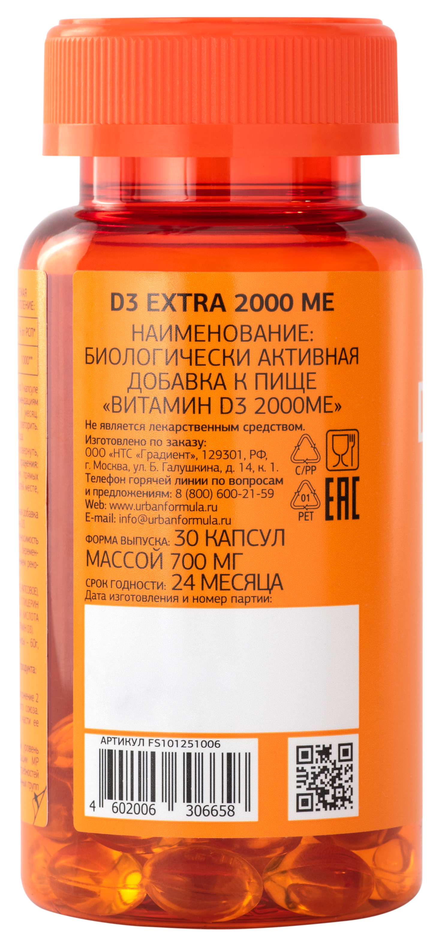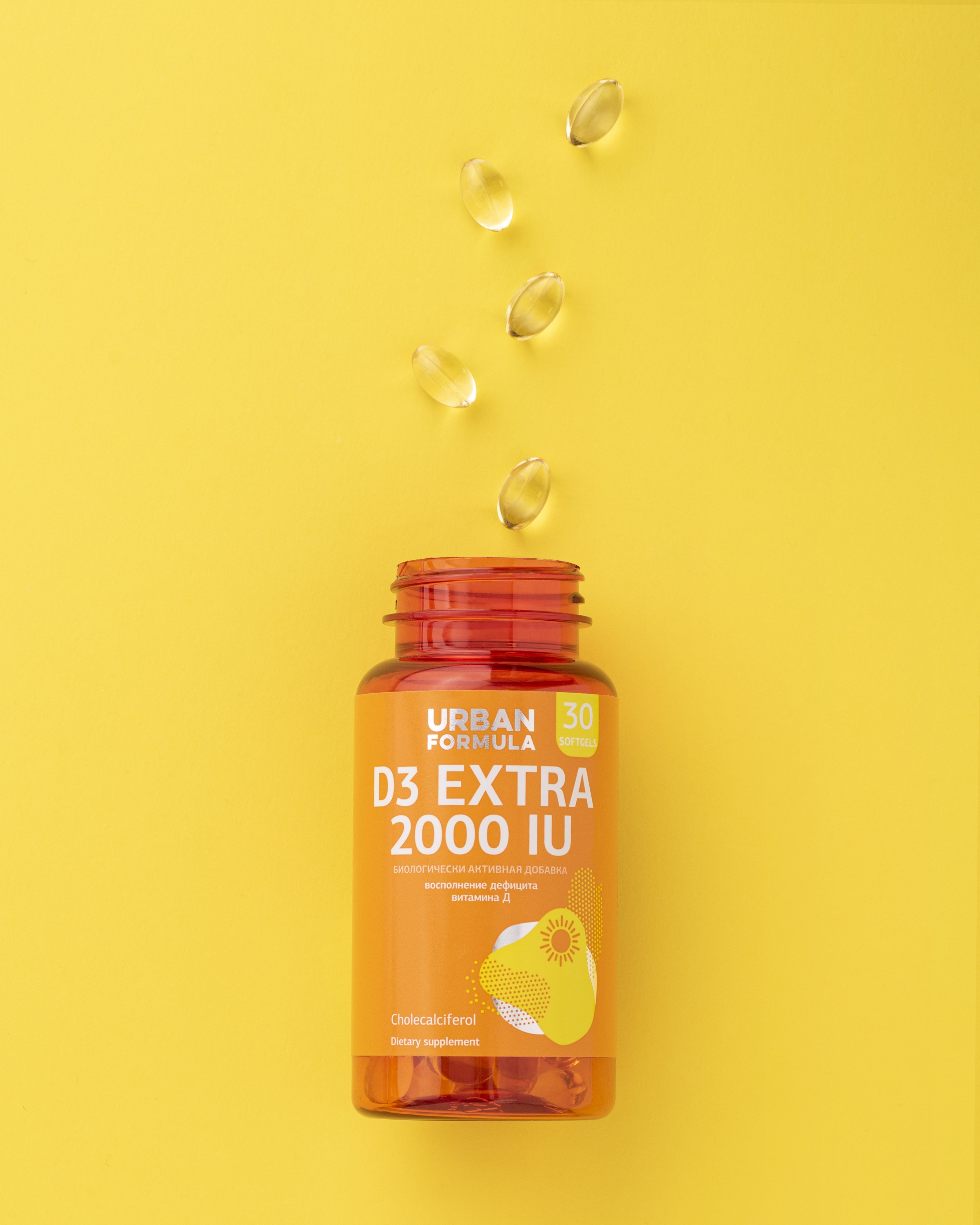 Биологически активная добавка к пище Urban Formula D3 Extra 2000 IU (2000 МЕ). Рекомендуется в качестве дополнительного источника и восполнения дефицита витамина Д3.
