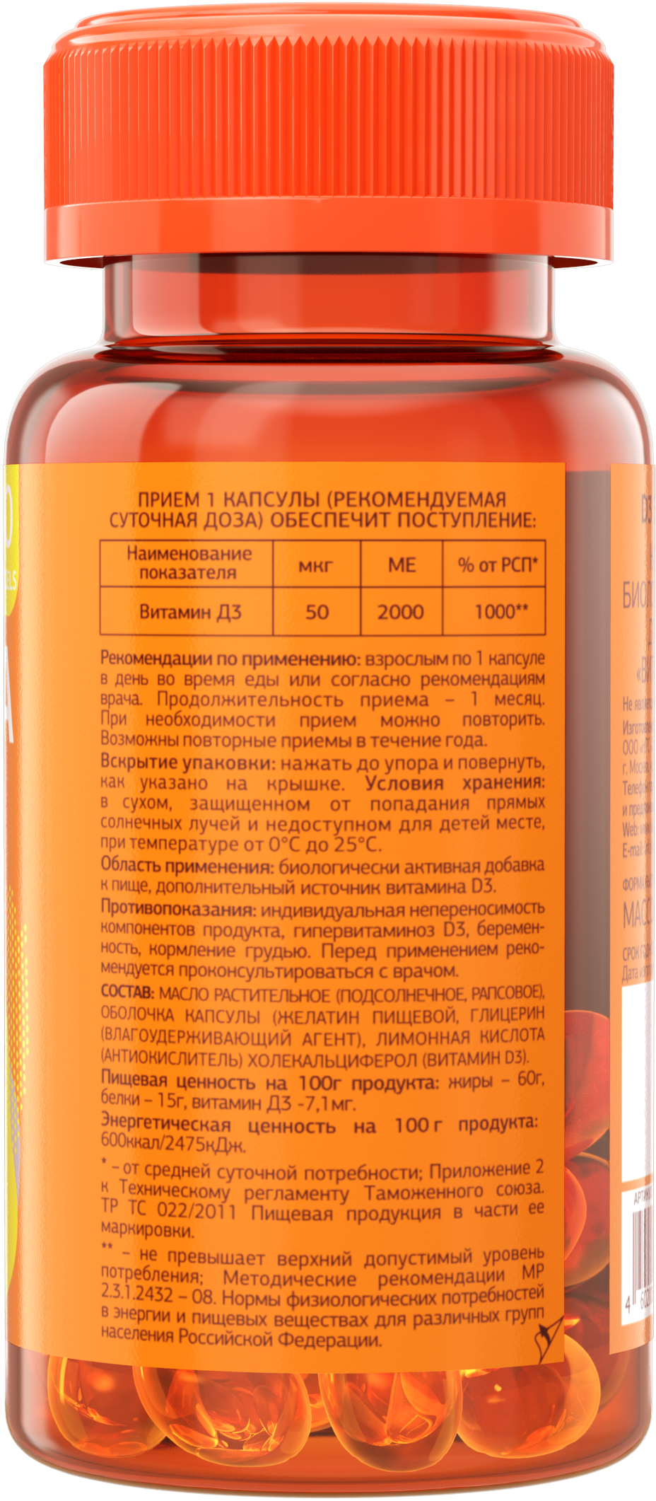 Масло Растительное (Подсолнечное, Рапсовое), Оболочка Капсулы (Желатин Пищевой, Глицерин (Влагоудерживающий Агент), Лимонная Кислота (Антиокислитель) Холекальциферол (Витамин D3).