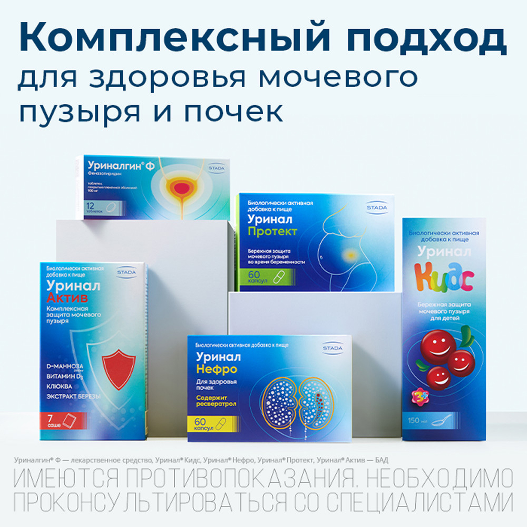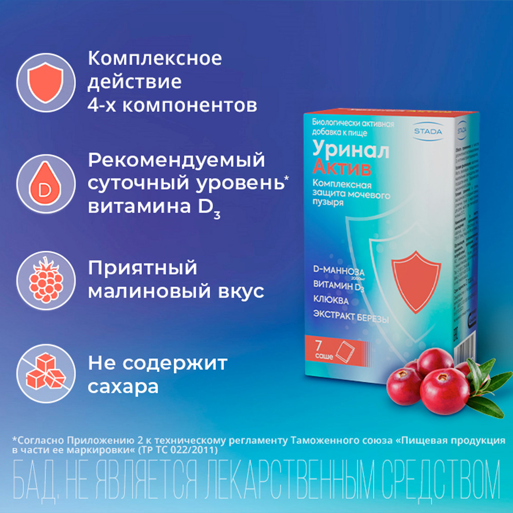 В качестве дополнительного источника витамина D3 и источника проантоцианидинов. Биологически активная добавка к пище Уринал Актив содержит уникальную комбинацию действующих веществ в специально подобранных для защиты организма при цистите в форме освежающего напитка с приятным малиновым вкусом (без дополнительного сахара в составе). Не содержит красителей и консервантов. Напиток на основе саше можно употреблять и в холодном, и в горячем виде. Жидкая форма является предпочтительной, так как она естественным путем повышает суточное потребление жидкости организмом, что является важным фактором здоровья мочевыделительной системы. В рекомендуемой дозе может служить дополнительным источником проантоцианидинов и витамина D3, а также способствовать поддержанию функции мочевыделительной и иммунной систем. Подходит как для моноприменения, так и для комбинированного приема (например, совместно с антибиотиками).