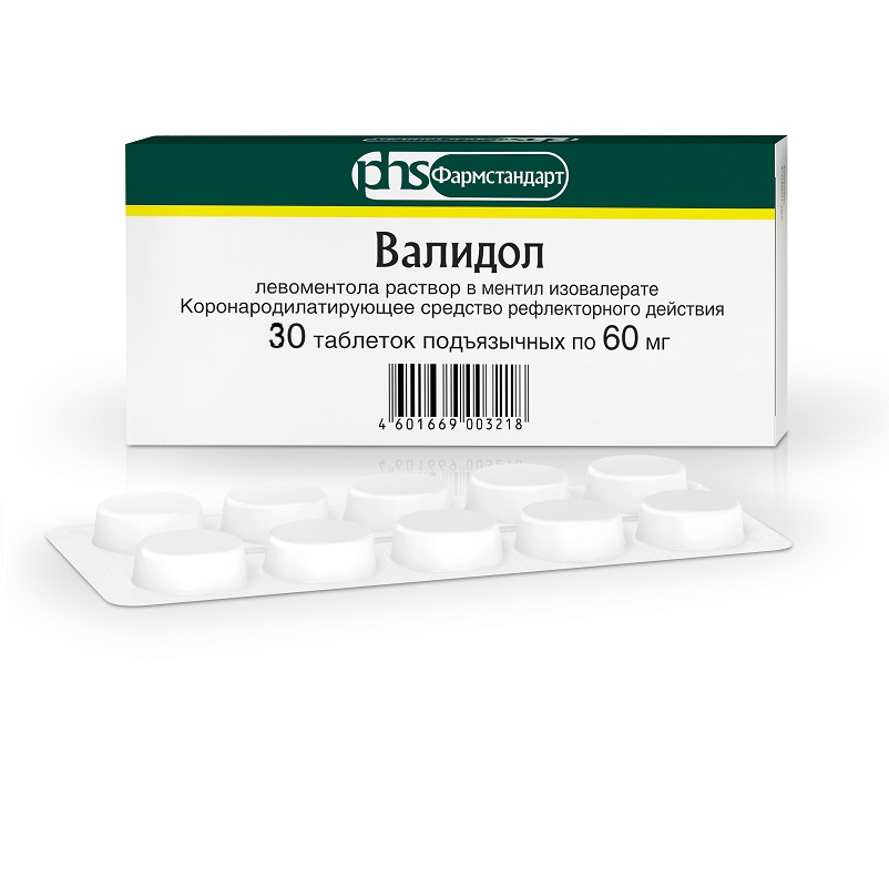 Действующее вещество: левоментола раствор в ментил изовалерате (валидол) - 60,0 мг;