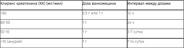 При анурии данную таблицу нельзя применять для определения дозы препарата. При анурии начальная доза - 15 мг/кг для быстрого создания терапевтических концентраций ванкомицина в сыворотке, для стабильной концентрации препарата поддерживающая доза - 1,9 мг/кг/сутки.