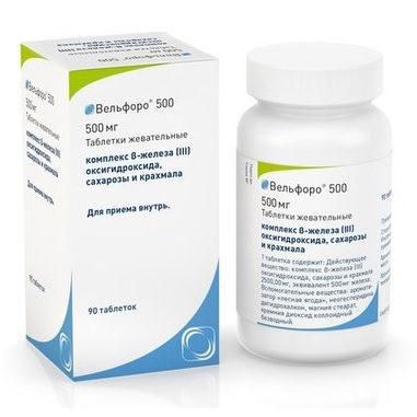 Действующее вещество препарата Вельфоро® 500 представляет собой комплекс β-железа (III) оксигидроксида (pn-FeOOH), сахарозы и крахмала. Связывание с фосфатом происходит путем обмена лигандами между гидроксильными группами и/или водой и фосфат-ионами в интервале физиологических значений pH в желудочно-кишечном тракте (ЖКТ).