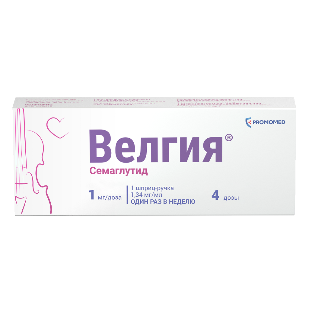 Велгия® – это препарат, содержащий действующее вещество семаглутид, который назначается в качестве дополнения к низкокалорийной диете и физической активности для коррекции и контроля массы тела. Семаглутид относится к средствам для лечения сахарного диабета; гипогликемическим средствам, кроме инсулинов. Семаглутид является аналогом природного гормона – глюкагоноподобного пептида-1 (ГПП-1), который выделяется после приема пищи и служит физиологическим регулятором углеводного обмена (уровня инсулина и глюкозы), а также аппетита и потребления пищи. Семаглутид воздействует на мишени (рецепторы) в головном мозге, которые контролируют аппетит, что помогает Вам быстрее почувствовать себя сытым, сохранить это ощущение надолго и снизить повышенную тягу к приему пищи. Также семаглутид затормаживает эвакуацию пищи из желудка, что дополнительно поддерживает длительное ощущение сытости. Такой механизм поможет Вам привыкнуть к правильному питанию и эффективно снизить массу тела. При приеме семаглутида наблюдаются дополнительные эффекты, такие как уменьшение окружности талии, улучшение обмена веществ (уровня липидов, глюкозы и др.), улучшение параметров сердечно-сосудистой системы (артериальное давление, пульс). Снижение массы тела на фоне приема семаглутида способствует уменьшению риска развития осложнений, связанных с наличием повышенной массы тела, в частности, сердечно-сосудистых заболеваний, сахарного диабета 2 типа (СД2), репродуктивных нарушений, заболеваний суставов, печени и др.
