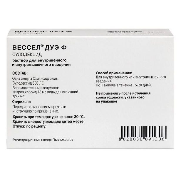 Вессел® Дуэ Ф (сулодексид) является биологическим лекарственным препаратом, представляющим собой естественную смесь гликозаминогликанов (ГАГ): гепариноподобной фракции с молекулярной массой 8000 дальтон (80%) и дерматансульфата (20%).