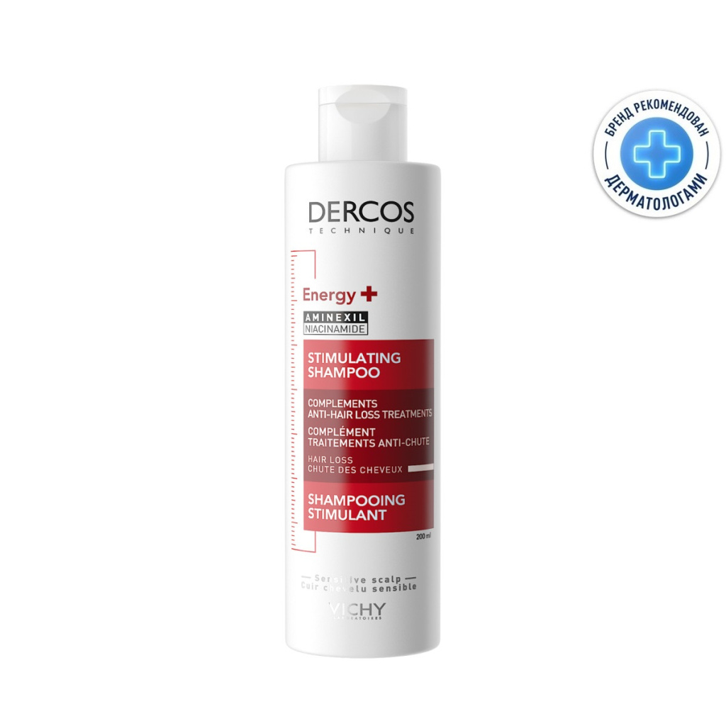 Шампунь с перламутровой гелевой текстурой Vichy Dercos Shampooing énergisant anti-chute содержит запатентованный комплекс Aminexil, который активизирует микроциркуляцию кожи головы, замедляет уплотнение коллагеновых оболочек волосяных фолликулов, восстанавливает здоровую структуру стержней волос. Результат – сокращение выпадения и ускорение роста волос, устранение их ломкости и сечения. Виши Деркос Шампунь Тонизирующий против выпадения волос сохраняет естественный уровень рН и гидролипидную защиту кожи головы и волос, поэтому подходит для частого использования. 78% из 154 участников трехнедельного дерматологического тестирования отметили, что выпадение существенно уменьшилось, а 76% – волосы стали сильнее от корней до кончиков. Применение этого шампуня повышает эффективность ампул Виши Деркос Аминексил ПРО против выпадения волос для мужчин и для женщин.