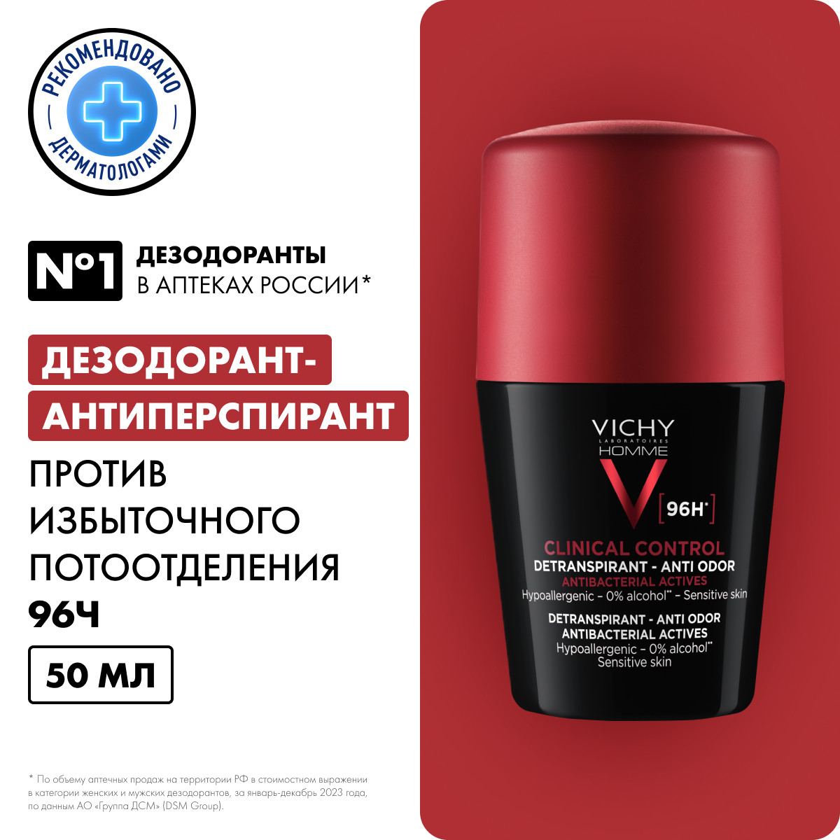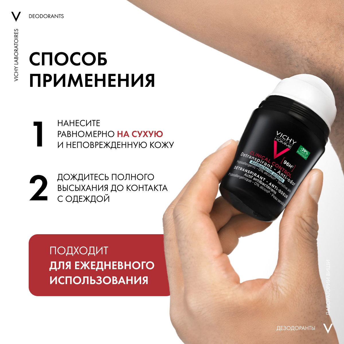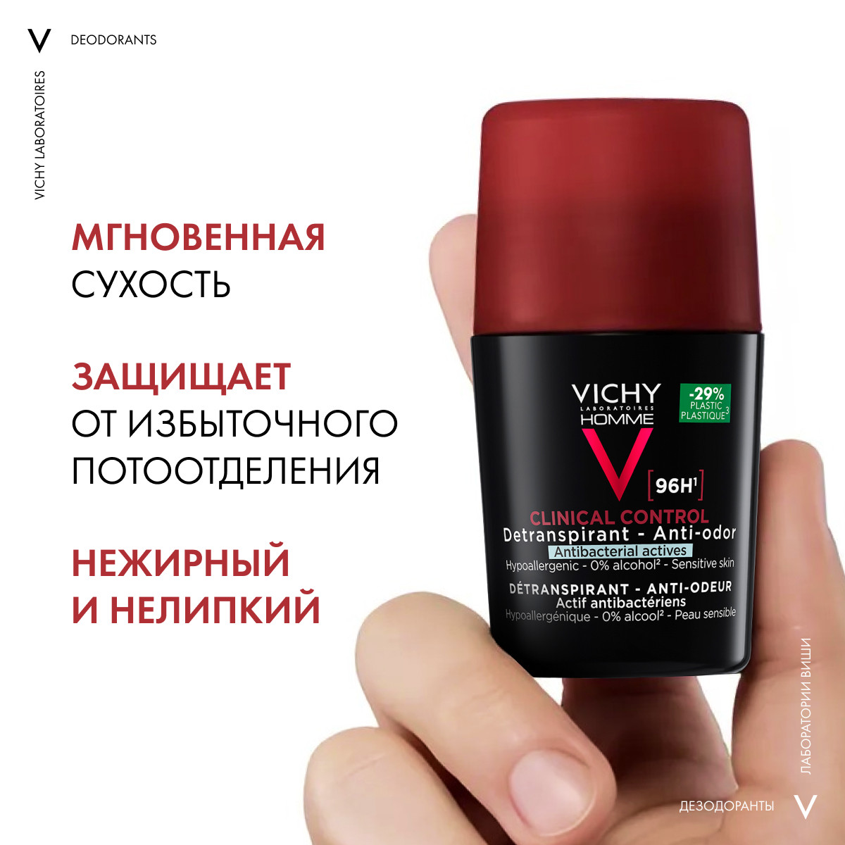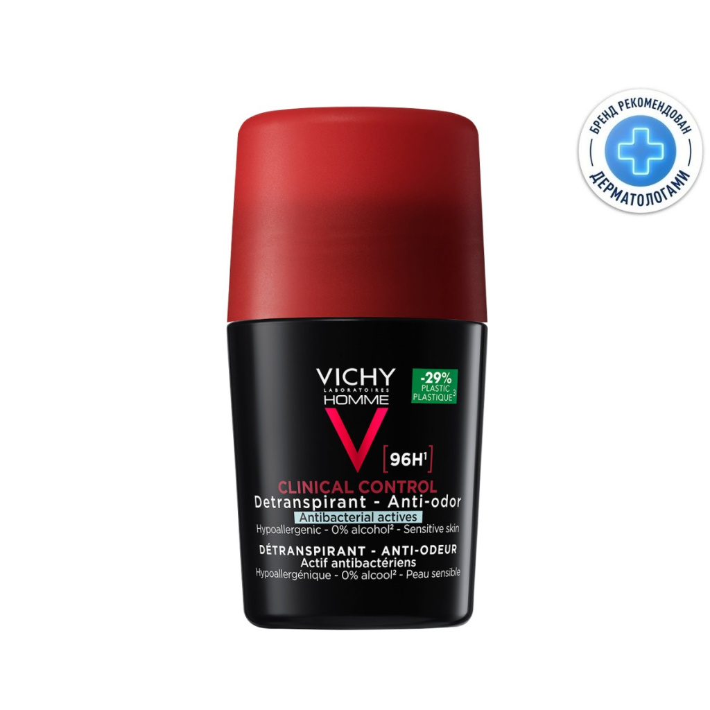 Vichy Homme Clinical Control Déodorant Anti-Transpirant 96 H – мощный Дезодорант-Антиперспирант, который помогает сохранить свежесть и комфорт в течение дня. Виши Ом Clinical Control Дезодорант-Антиперспирант 96 ч против избыточного потоотделения каждый день защищает от появления запаха и смягчает кожу, препятствует проявлению раздражения.