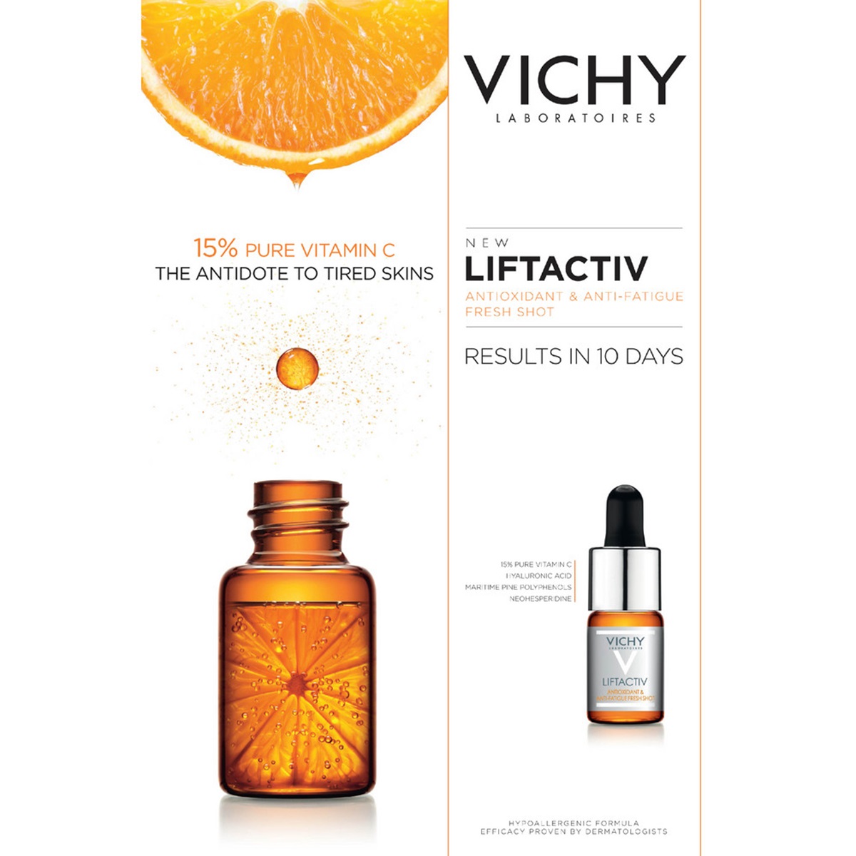 Для борьбы с признаками старения и усталости кожи лица технологи компании Vichy изобрели поистине фантастический продукт - Концентрат молодости, который стал бестселлером среди антивозрастных средств. Уже через 10 дней регулярного применения Вы заметите, как преображается кожа - она будто сияет изнутри. Vichy Liftactiv Anti-Oxidant and Anti-Fatigue Fresh Shot эффективно подтягивает овал лица, разглаживает морщины, нейтрализует окислительные процессы в верхних слоях эпидермиса. Витамин С в мощной концентрации 15% обеспечит коже отдохнувший вид. С помощью Концентрата Лифтактив лицо излучает молодость и здоровье.