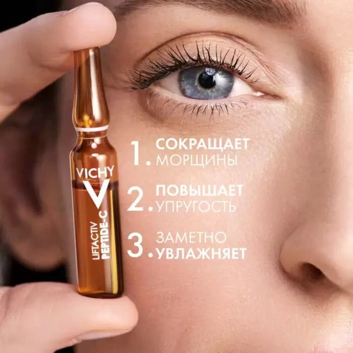 Омолаживающий уход Vichy Liftactiv Specialist Peptide-C ampoules anti-age начинает активно работать с первого применения: мгновенно возвращает комфорт, повышает упругость кожи уже на 10 день применения и через 1 месяц заметно сокращает даже глубокие морщины. В формуле сыворотки Виши Лифтактив Специалист Пептид-С присутствуют активные био-пептиды, которые отвечают за синтез коллагена, так необходимого для упругости и плотности кожи. Также в составе представлен известный антиоксидант - витамин С - в высокой концентрации 10%. Лёгкая текстура сыворотки способствует глубокому проникновению действующих веществ. Средство выпускается в ампулах из тёмного стекла, что позволяет защитить компоненты от воздействия внешних агрессий и сохранить первозданную эффективность формулы. По данным клинических испытаний, проходивших с участием 47 добровольцев, применявших сыворотку 28 дней: