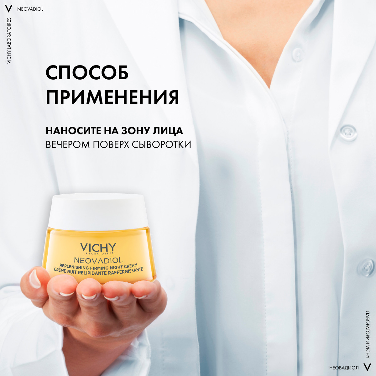 Нанесите средство на чистую кожу лица и шеи на ночь.