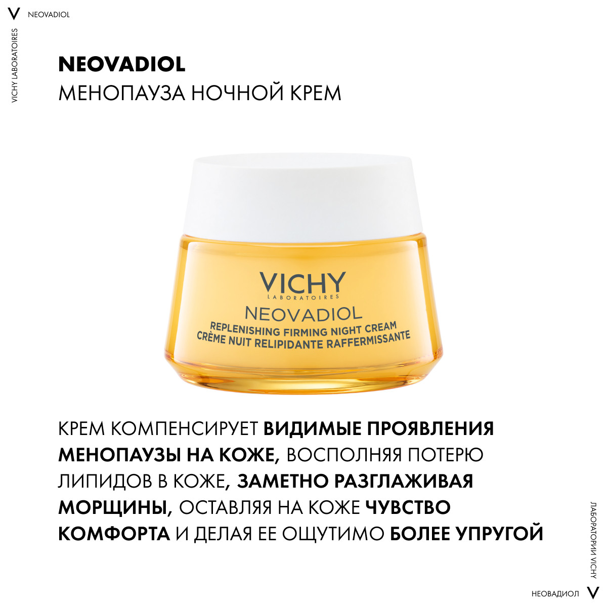 Активные ингредиенты Vichy Neovadiol Crème De Nuit Relipidante Raffermissante активируют механизмы восстановления кожи, компенсируют видимые проявления менопаузы на коже, восполняют потерю собственных липидов, разглаживают морщины и придают коже упругость. Виши Неовадиол Ночной восстанавливающий питательный крем помогает восстановить и сохранить ощущение комфорта на весь день, без труда справляясь с ощущениями сухости и стянутости.