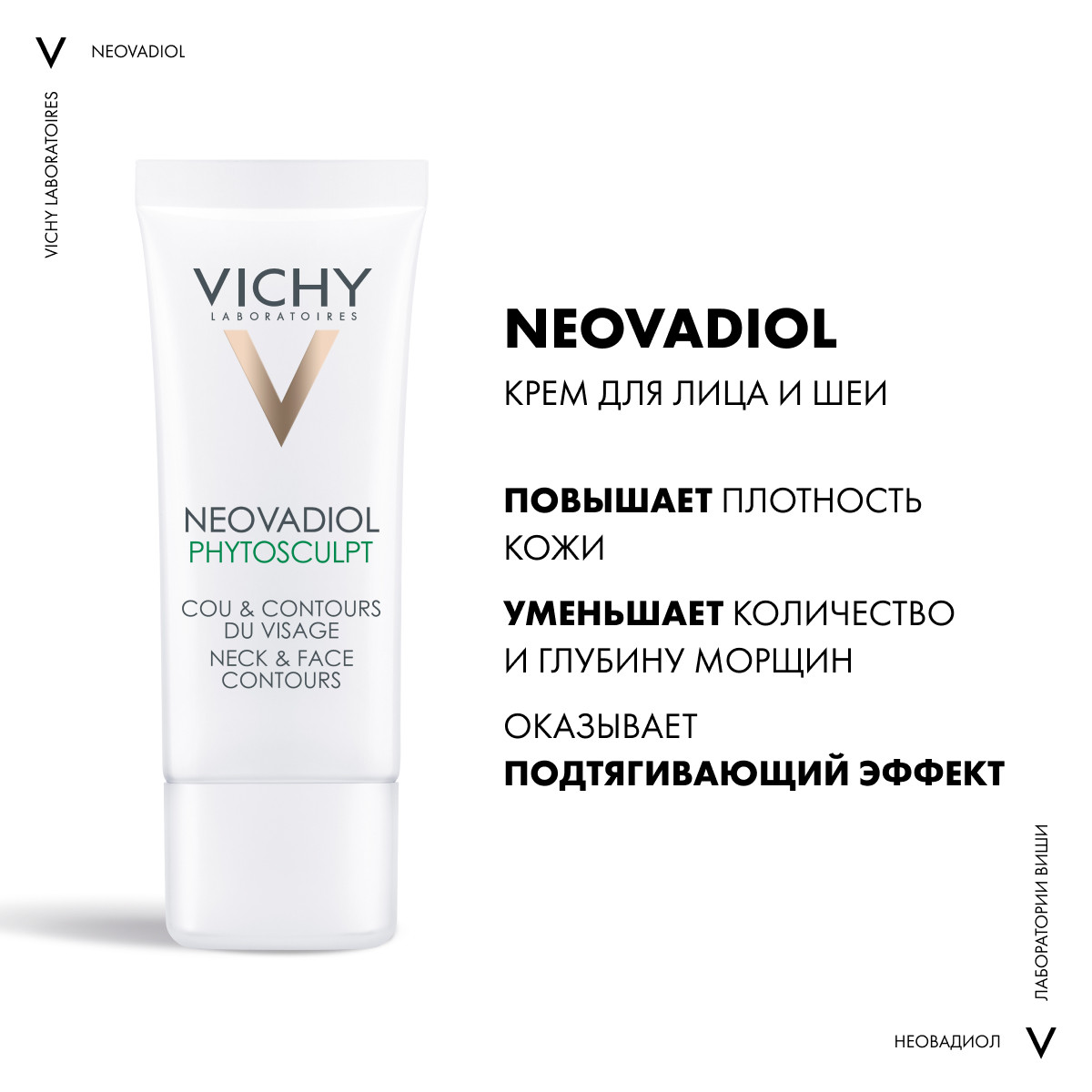 Учитывая специфические изменения кожи в период менопаузы, технологи компании Виши разработали инновационный омолаживающий крем с компенсирующим эффектом. Благодаря усиленной порции про-ксилана и гиалуроновой кислоты, Vichy Neovadiol Phytosculpt Neck and Face Contours подтягивает кожу, обновляет ее, придает эластичность кожным покровам, выравнивает их структуру. При регулярном использовании Виши Неовадиол Фитоскульпт кожа в области шеи преображается, значительно сокращаются морщинки в зоне декольте, подтягивается овал лица. Согласно результатам исследований, эффект заметен уже через 4 часа, а именно: