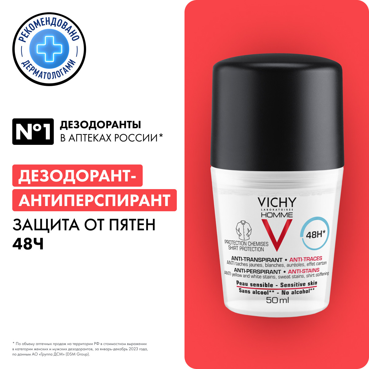 Ощущение свежести, рубашки без пятен - девиз Vichy Homme 48HR Anti-Perspirant Deodorant Anti-Marks. Продукт не оставляет следов на одежде, не раздражает чувствительную кожу. Удобная форма в виде стика, свежая ароматная композиция подарят удовольствие от использования средства. Эффективность подтверждена инструментальным тестом.