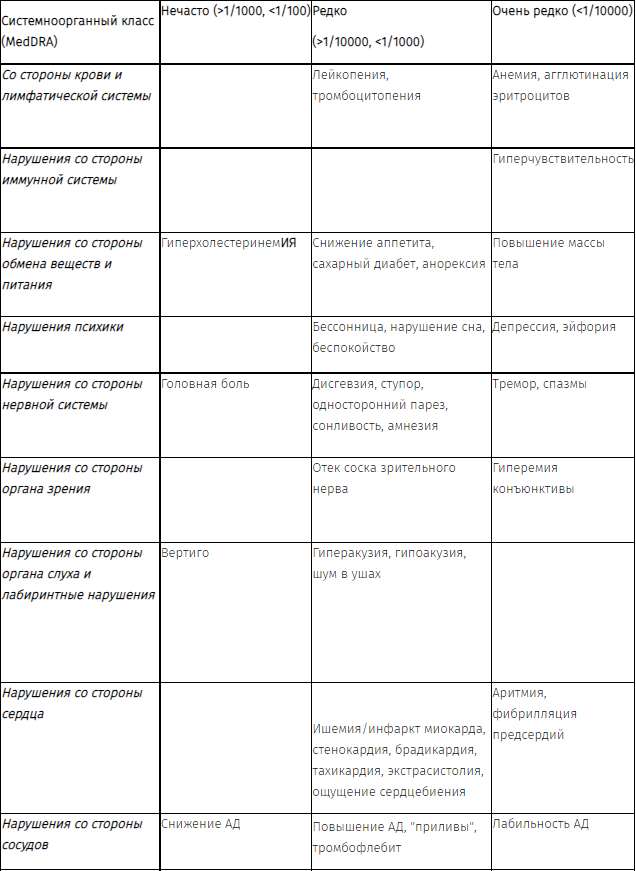 Частота побочных реакций приведена в виде следующей градации: очень часто (≥1/10); часто (≥1/100 - <1/10); нечасто (≥1/1000 - <1/100); редко (≥1/10000 - <1/1000); очень редко (<1/10000), включая отдельные сообщения; неуточненной частоты (частота не может быть подсчитана по доступным данным). В клинических исследованиях показано, что нежелательные лекарственные реакции с частотой "часто" (>1/100) не возникали, поэтому эта категория частоты была исключена из приведенной ниже таблицы