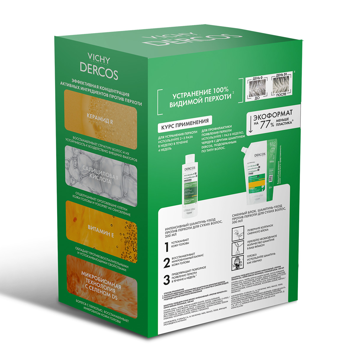 Шампунь-уход VICHY DERCOS против перхоти для сухих волос – самый эффективный ингредиент против перхоти. Восстанавливает микробиомный баланс кожи головы и барьерные функции, устраняет зуд и предотвращает повторное появление перхоти.