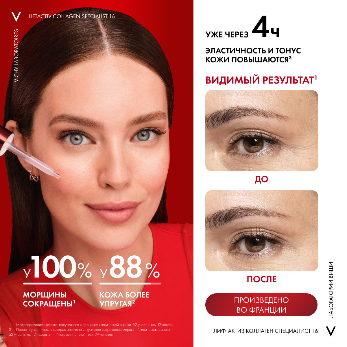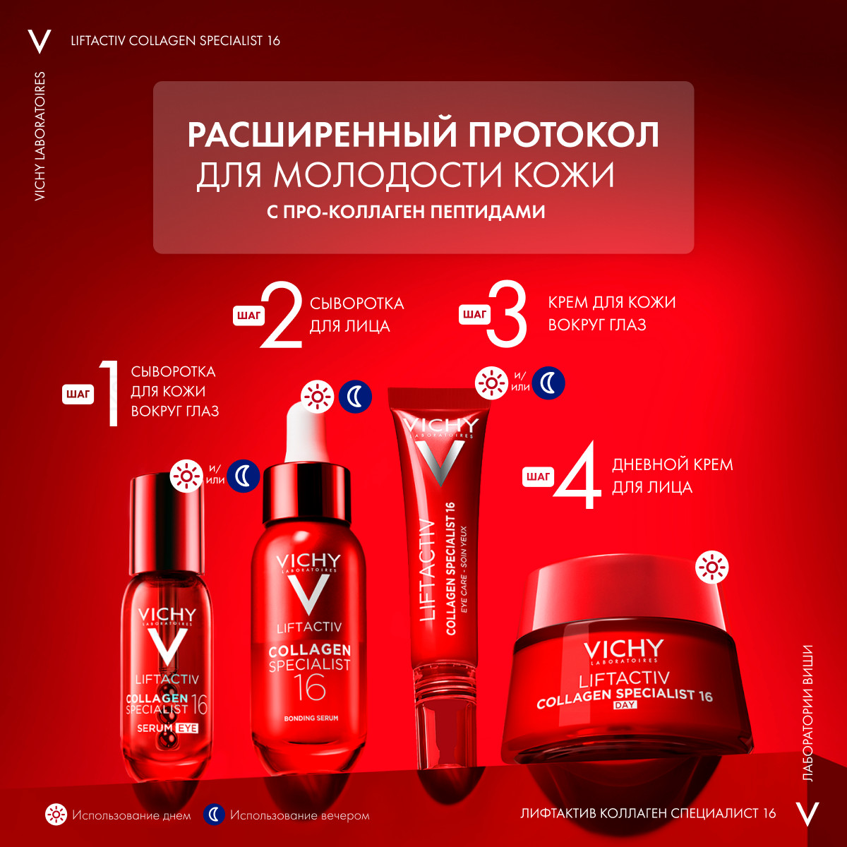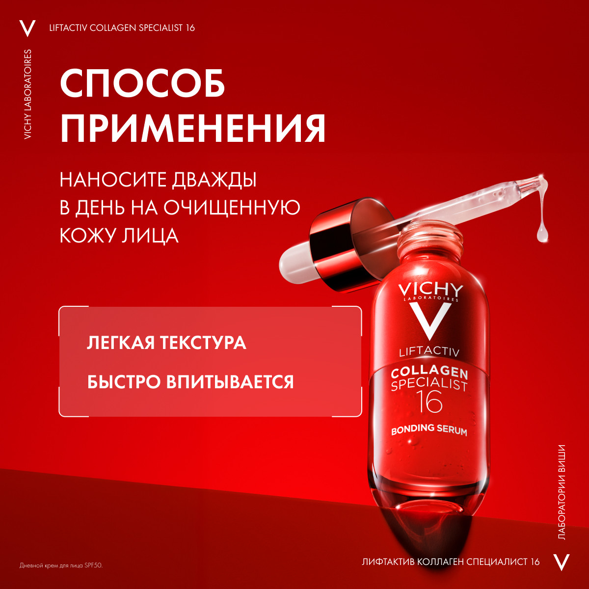 Продукт относится к категориям: anti-age, серум для лица, французская аптечная косметика для женщин и мужчин. Подходит для всех типов кожи: чувствительной, нормальной, жирной, сухой и комбинированной. Используется в качестве антивозрастной уходовой косметики после 35-45 лет. Разглаживает глубокие мимические морщины. Применяется как пептидная омолаживающая лифтинг-сыворотка. Vichy LiftActiv Collagen Specialist – Виши Лифтактив Коллаген Специалист